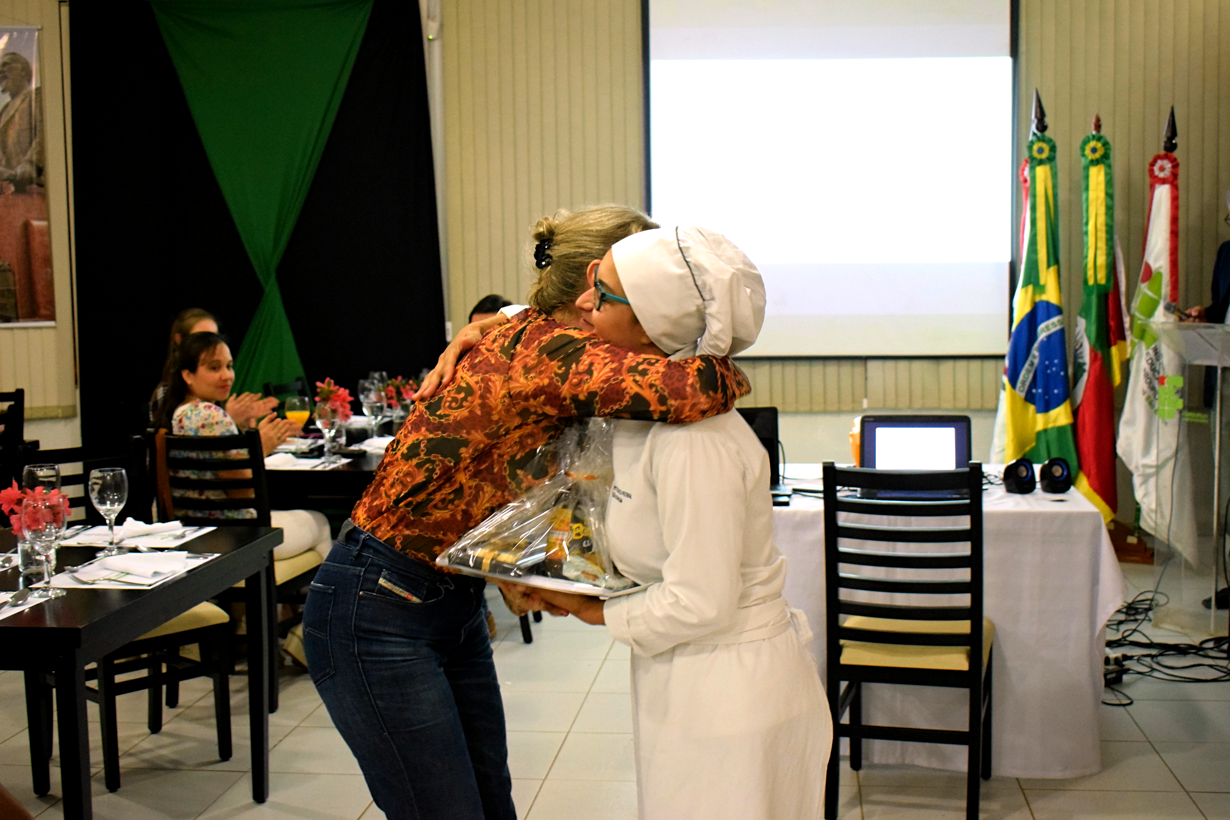 Foto: Palestrante Rut Maria Friedrich Marquetto com a professora do curso de Gastronomia Aline Roque, durante o jantar de encerramento da Semana da Gastronomia.