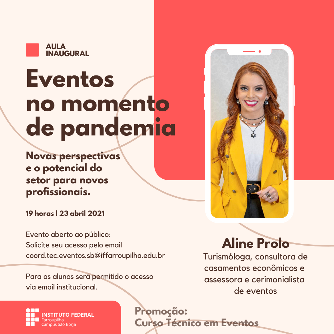 Aline Prolo, Turismóloga, consultora de casamentos econômicos e cerimonialista e assessora de eventos é a convidada do Curso Técnico em Eventos para realizar a palestra de abertura do ano letivo 2021 sob o tema “Eventos no momento de pandemia: novas perspectivas e o potencial do setor para novos profissionais".