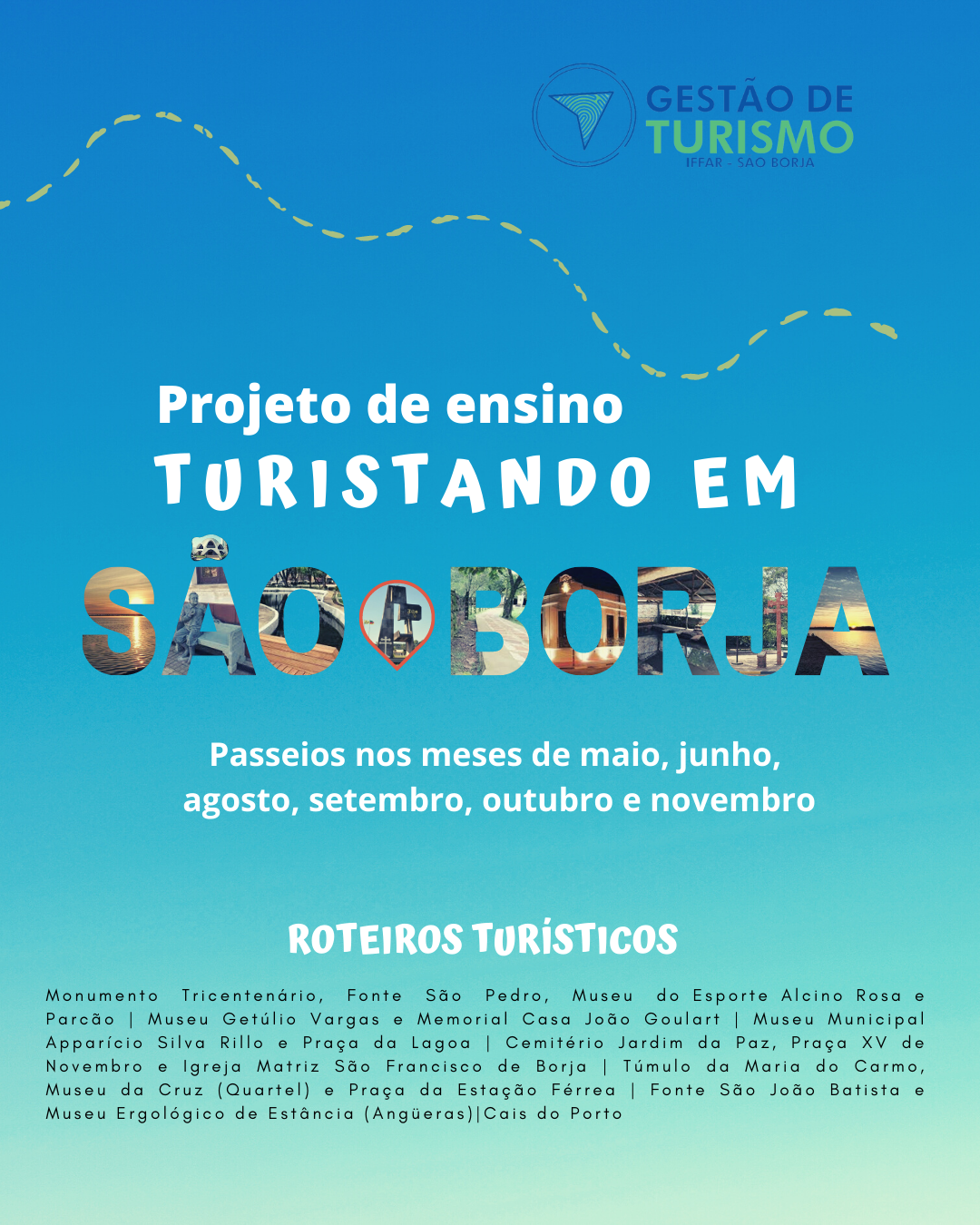 Com o objetivo de prestigiar e conhecer melhor os locais turísticos da cidade, o Curso de Tecnologia em Gestão de Turismo, inicia neste sábado (28), o primeiro roteiro turístico do projeto de ensino “Turistando em São Borja”.