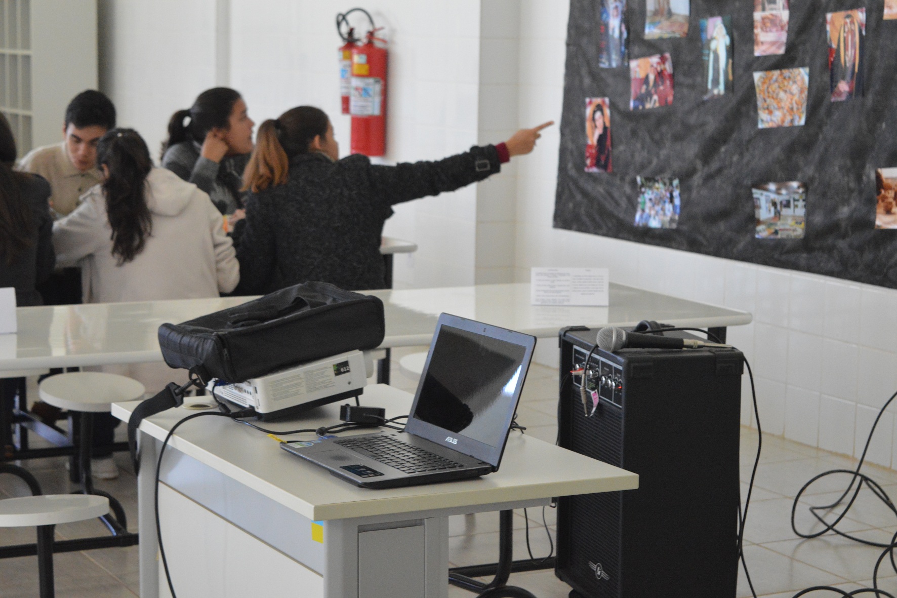 Ao fundo, alunas conferem exposição fotográfica da comunidade árabe em São Borja