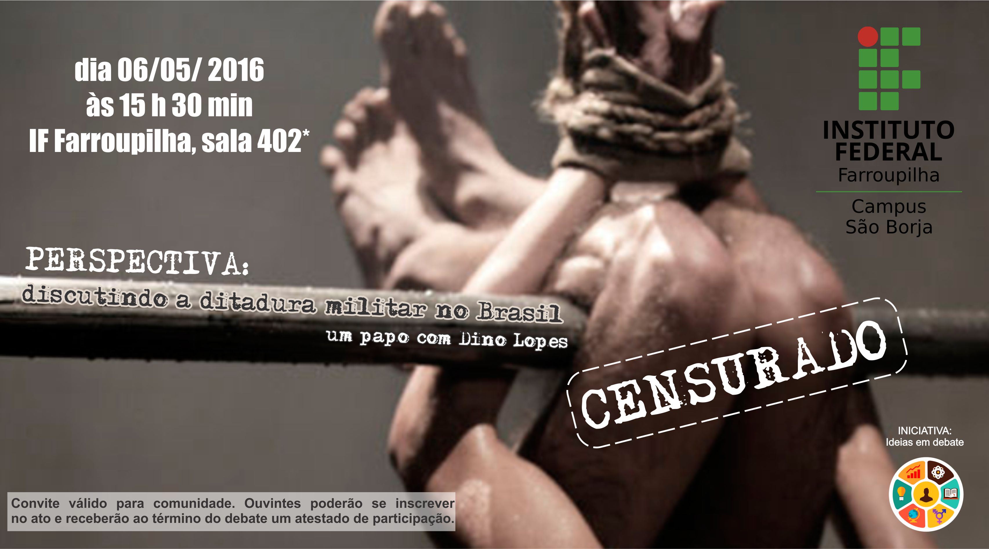 O projeto Ideias em Debate promoverá uma atividade com o advogado são-borjense Dino Lopes, nesta sexta-feira (06), sala 402, prédio ensino, sobre o período da ditadura militar no Brasil. Serão abordadas diversas questões, referentes ao período e que tem sido rediscutidas na atualidade.