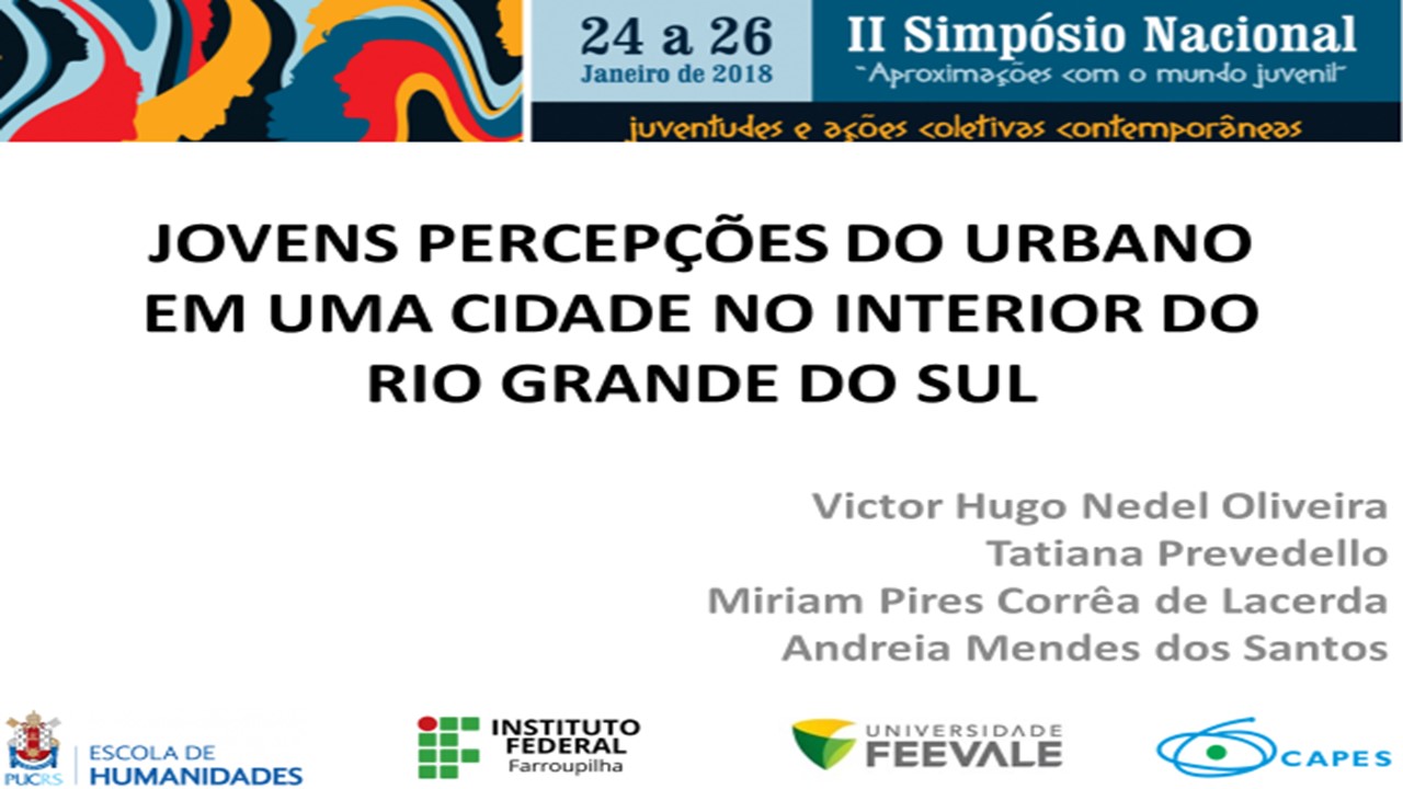 Entre os dias 24 a 26 de janeiro deste ano, a Professora do Instituto Federal Farroupilha – Campus São Borja, Tatiana Prevedello e Professor do Colégio de Aplicação da UFRGS, Victor Hugo Nedel de Oliveira, participaram do II Simpósio Nacional "Aproximações com o Mundo Juvenil: juventudes e ações coletivas contemporâneas”, na Faculdade Jesuíta de Teologia e Filosofia - FAJE, em Belo Horizonte, apresentando o trabalho “Jovens percepções do urbano em uma cidade no interior do Rio Grande do Sul", o qual, se trata de uma pesquisa inédita e única do gênero realizada com os alunos do Ensino Técnico Integrado do IFFar - Campus São Borja. O estudo integra um projeto piloto desenvolvido na tese do Prof. Victor Nedel, que atualmente é doutorando em Educação na PUCRS. Victor também é colaborador externo do grupo de pesquisa "Pensamento em ruptura e educação no contemporâneo", do Campus São Borja, coordenado pela Professora Cristiane Ludwig.