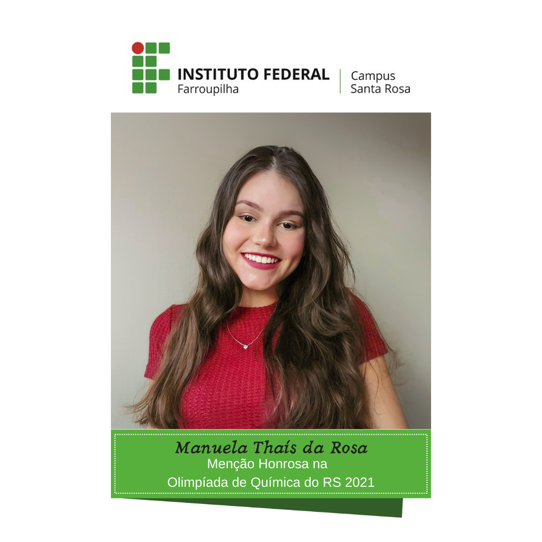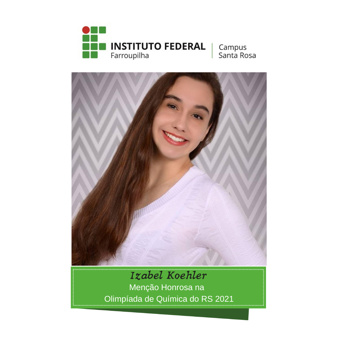 Alunas do Curso Técnico Integrado em Edificações do IFFar Campus Santa Rosa receberam menção honrosa pela participação na Olimpíada de Química do RS 2021. A solenidade virtual de apresentação dos resultados aconteceu na sexta-feira (17/12), com transmissão pelo YouTube. As alunas contempladas foram Izabel Koehler, do 2º ano do Curso Técnico em Edificações (EDIT11), na Modalidade A (para alunos matriculados no 9º ano do ensino fundamental, no 1º e no 2º ano do ensino médio); e Manuela Thaís da Rosa, do 3º ano do Curso Técnico em Edificações (EDIT10), na Modalidade B (para alunos matriculados no 3º ano do ensino médio e 4º ano do ensino técnico).