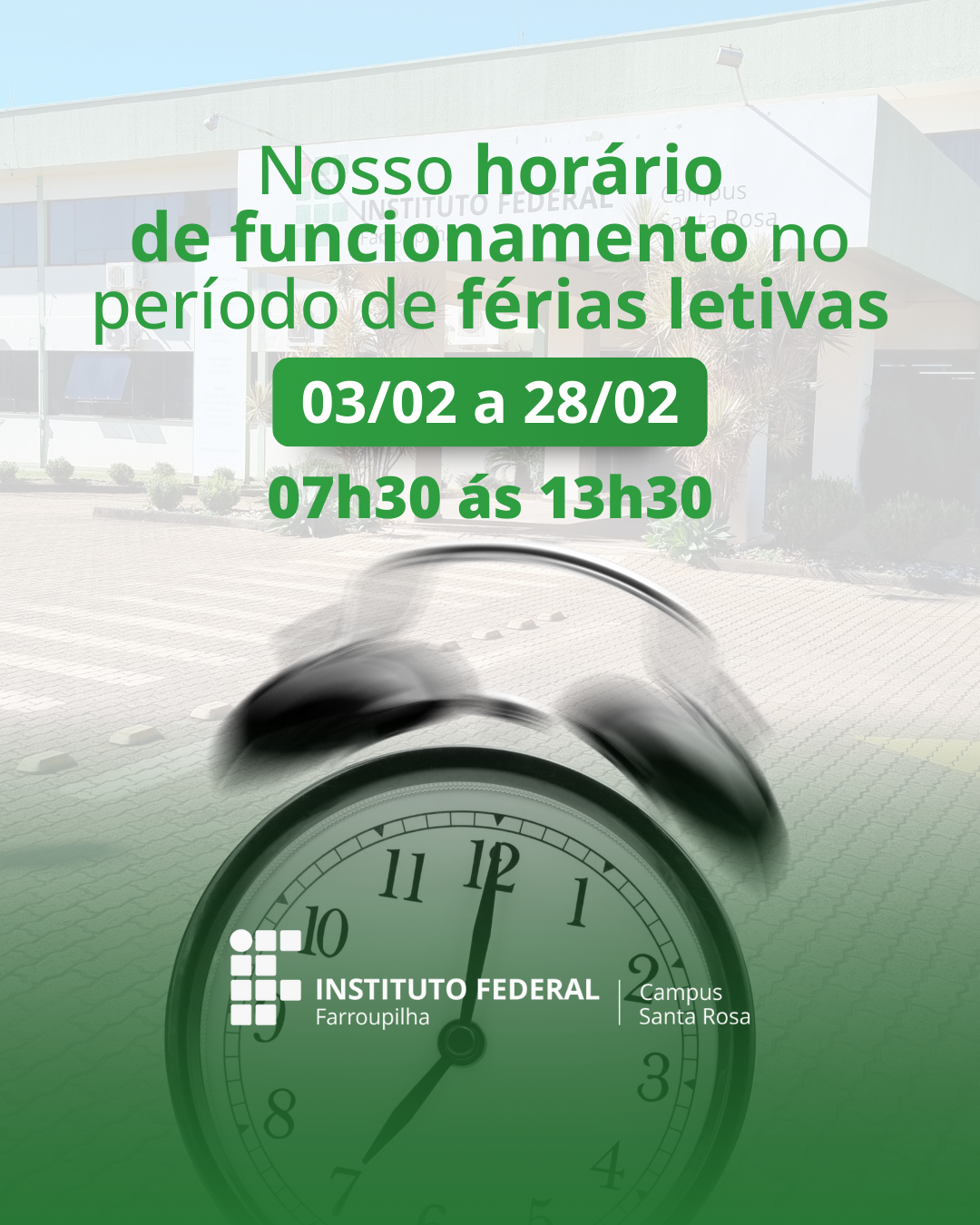 O IFFar Campus Santa Rosa informa o horário de atendimento durante o período de férias letivas: