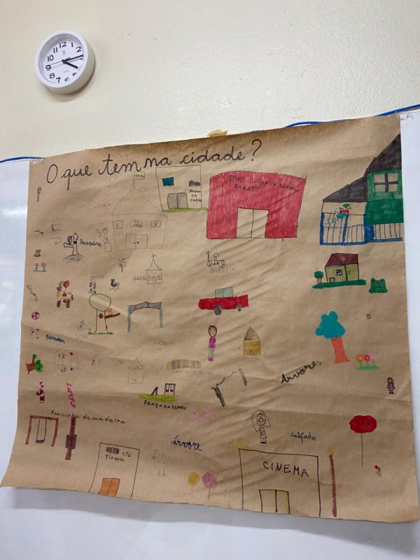 Após estudos teóricos, diagnósticos urbanos e análise de condicionantes legais, os acadêmicos realizaram atividades de campo com uma turma do 3º ano do Ensino Fundamental. A programação incluiu uma conversa inicial sobre a cidade, a produção de desenhos a partir das percepções das crianças sobre o espaço urbano e uma caminhada orientada pelo entorno da escola, organizada em grupos temáticos.