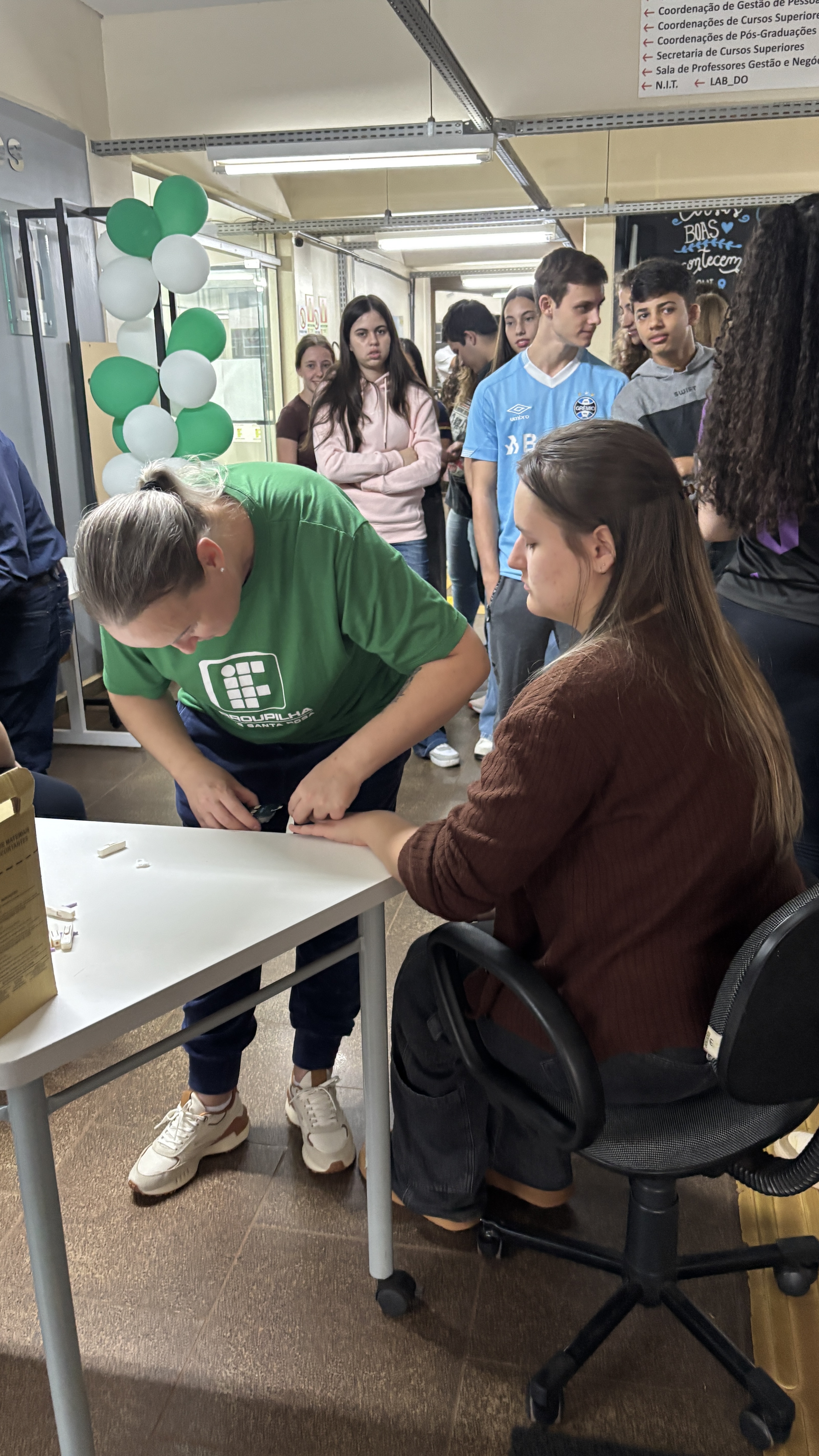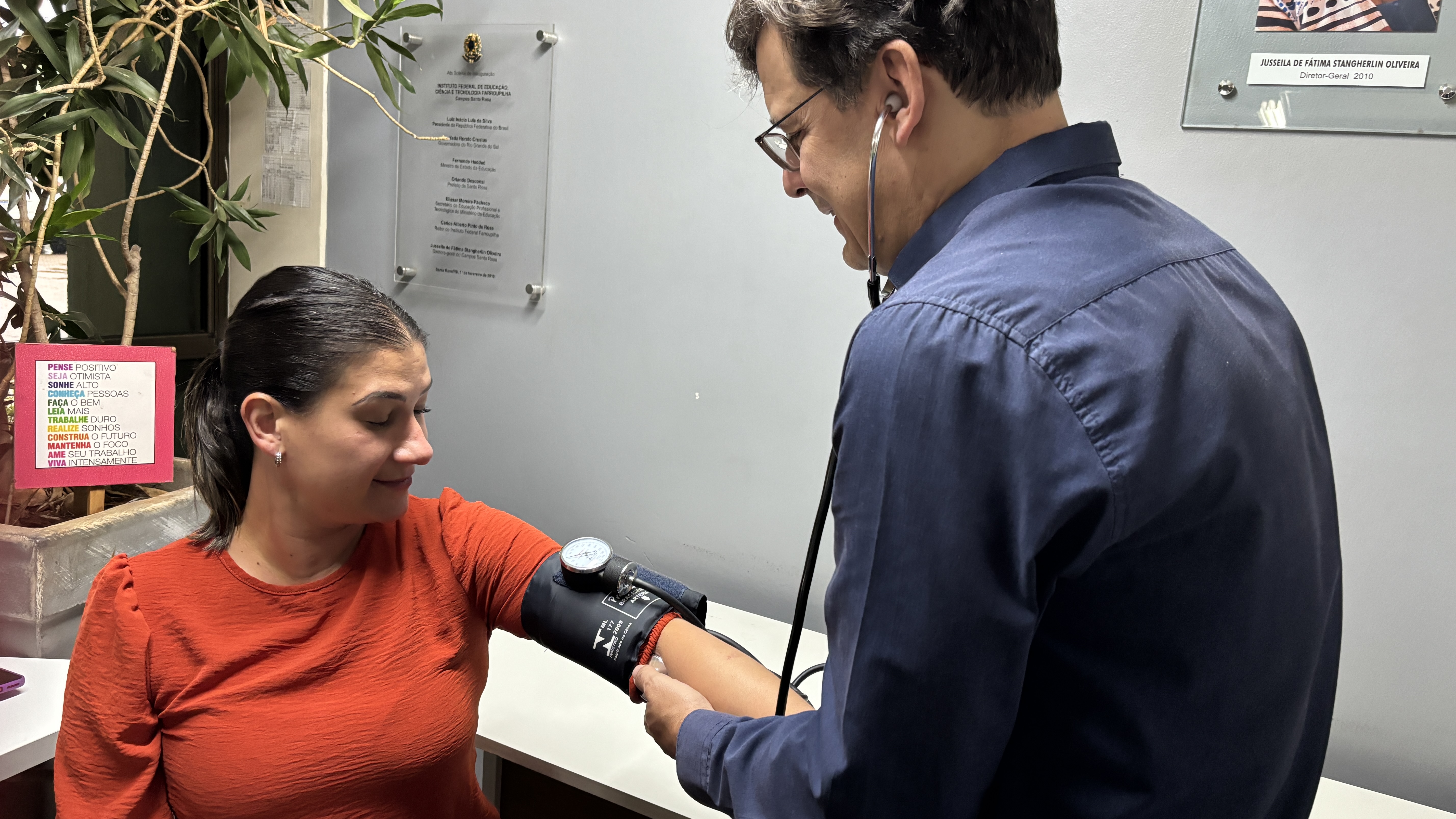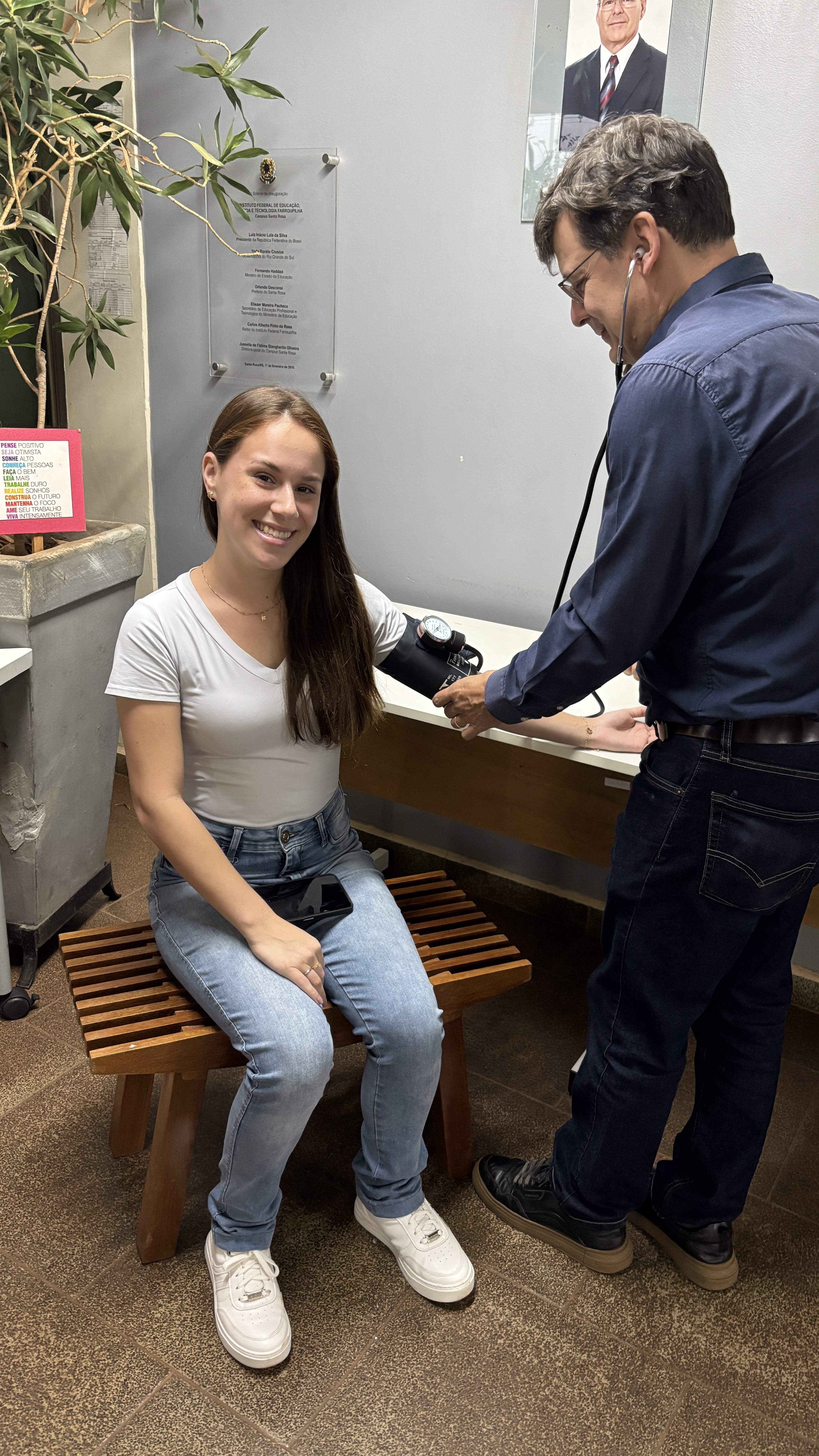 No dia 07 de abril de 2026, a equipe médica da Coordenação de Assistência Estudantil do IFFar - Santa Rosa realizou, no Hall de Entrada de Campus, uma ação em comemoração ao Dia Mundial da Saúde. O médico especialista Alexandre Rigo Magalhães e a enfermeira Juliane Krebs Bessel realizaram diversos testes em alunos e servidores interessados, promovendo o cuidado com a saúde e bem-estar da comunidade.