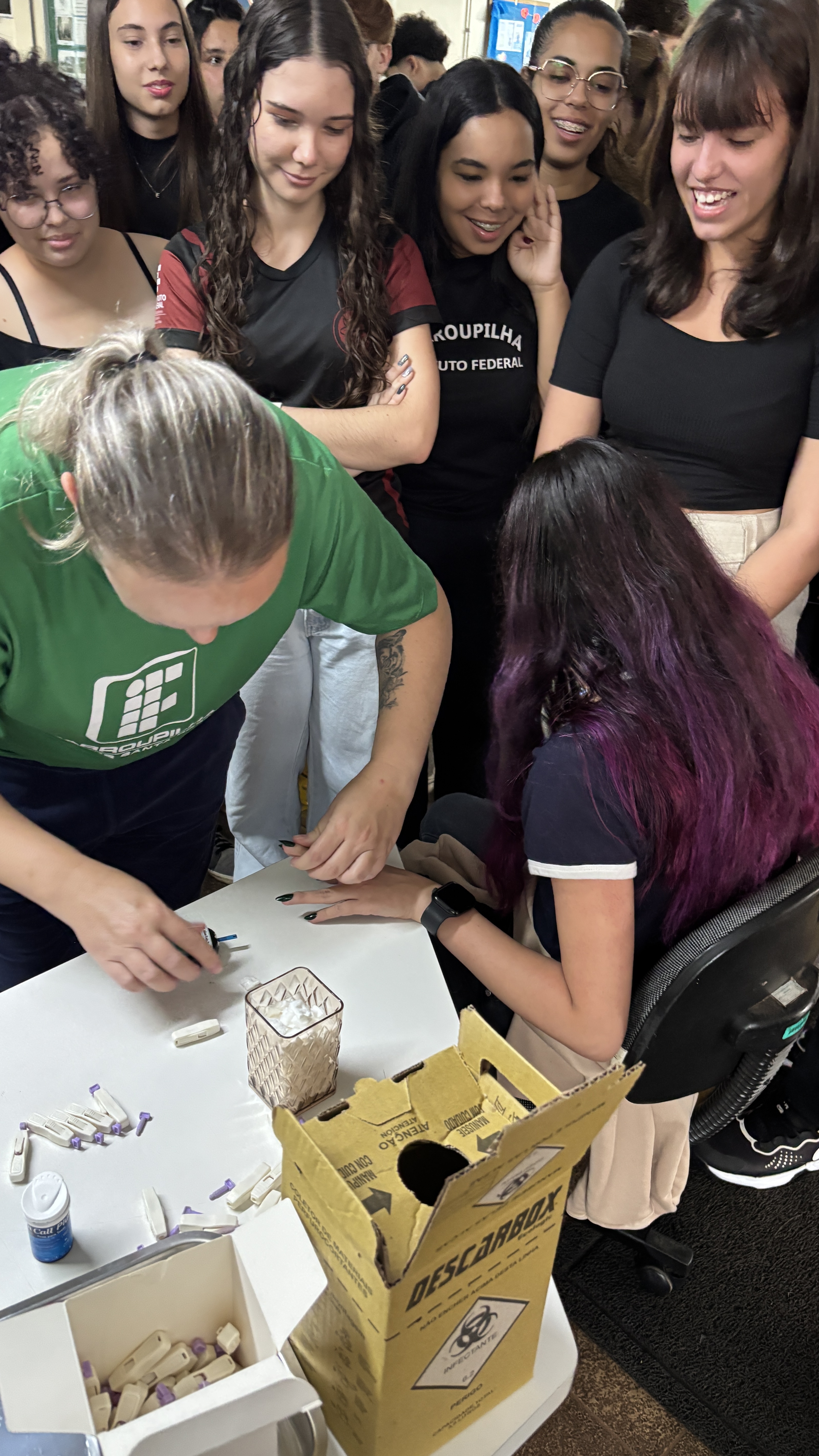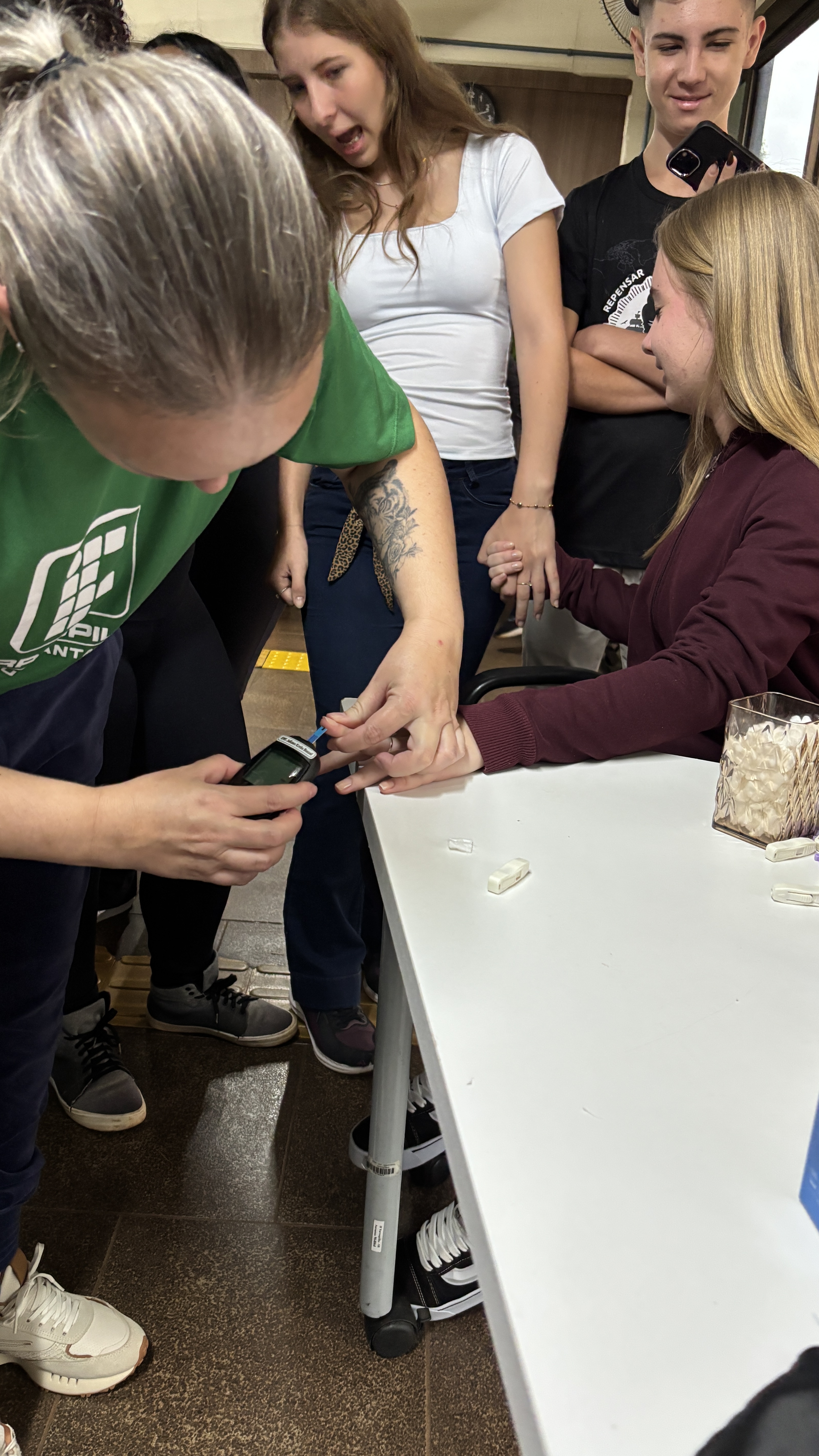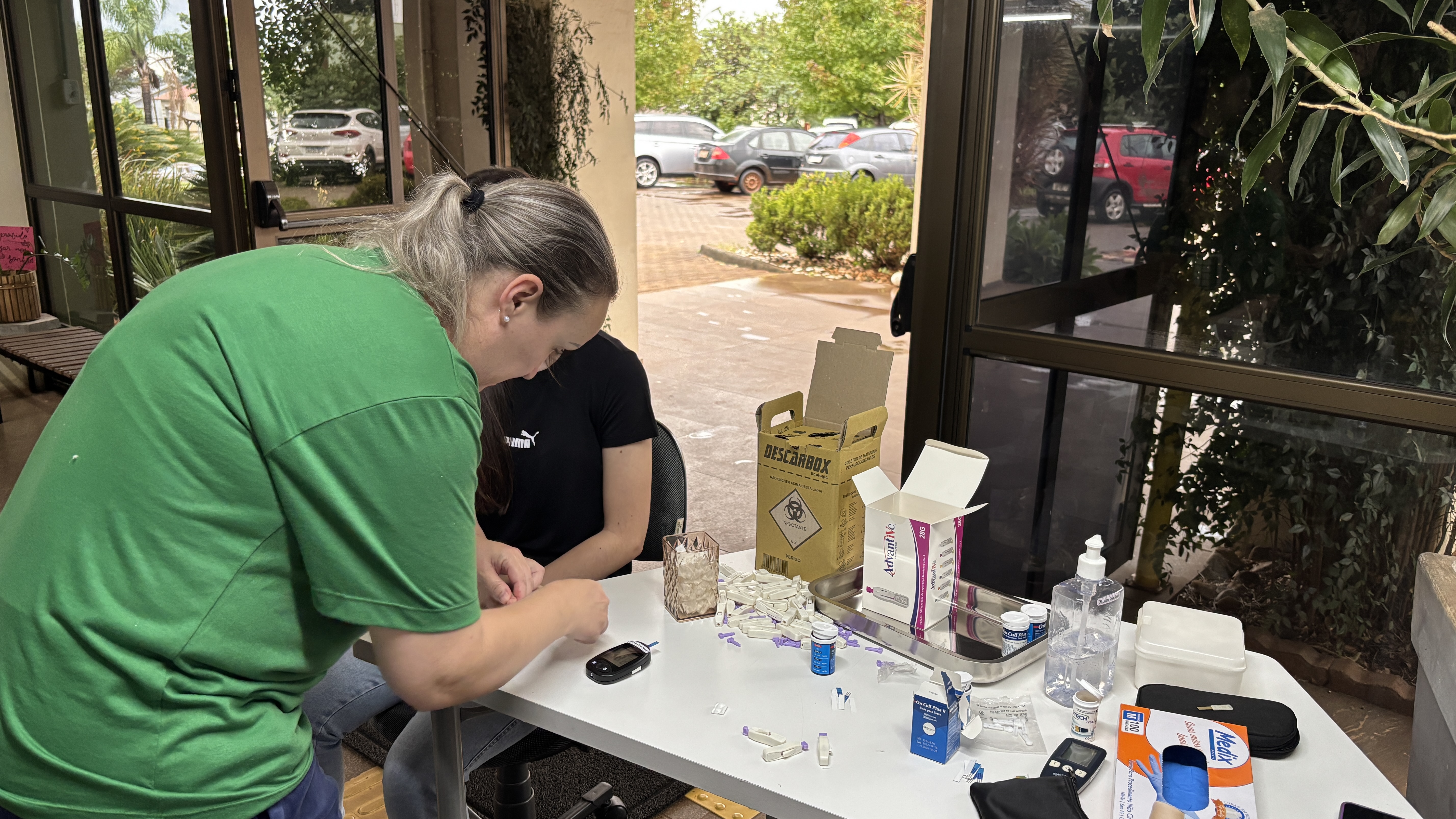 No dia 07 de abril de 2026, a equipe médica da Coordenação de Assistência Estudantil do IFFar - Santa Rosa realizou, no Hall de Entrada de Campus, uma ação em comemoração ao Dia Mundial da Saúde. O médico especialista Alexandre Rigo Magalhães e a enfermeira Juliane Krebs Bessel realizaram diversos testes em alunos e servidores interessados, promovendo o cuidado com a saúde e bem-estar da comunidade.