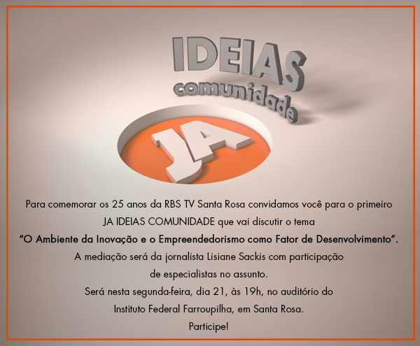 O JA Ideias Comunidade com o tema "O ambiente da inovação e o empreendedorismo como fator de desenvolvimento" será realizado no audtiório do IFFar Campus Santa Rosa, no dia 21 de agosto às 19 h. A mediação será realizada pela jornalista Lisiane Sackis com participação de especialistas no assunto.