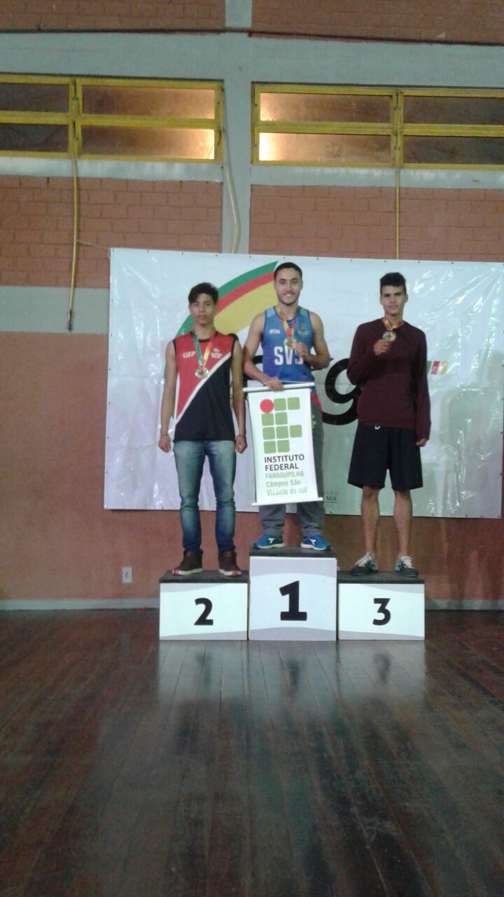 Nos dias 5, 6 e 7 de agosto foi disputada na cidade de Osório a final estadual dos JERGS de atletismo. O campus São Vicente do Sul representados pelos alunos Deivisson, João Felipe, Tales Celestino e Humberto, e pelo professor Haury Temp obteve excelentes resultados, sagrando - se bicampeão estadual no revezamento 4x100 e campeão nos 400m.