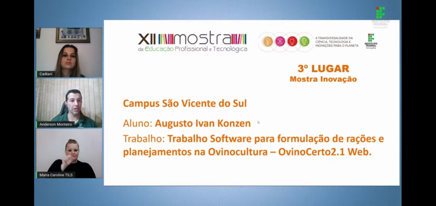 - 3º Lugar - "Trabalho Software para formulação de rações e planejamentos na Ovinocultura – OvinoCerto2.1 Web", do acadêmico Augusto Ivan Konzen e orientação de Rafael Sanchez Venturini, Gustavo Rissetti e Eliana Zen.