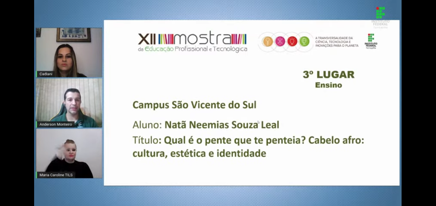 - 3º lugar - “Qual é o pente que te penteia? Cabelo afro: cultura, estética e identidade”, do aluno Natã Neemias Souza Leal e orientação de Laís Braga Costa.