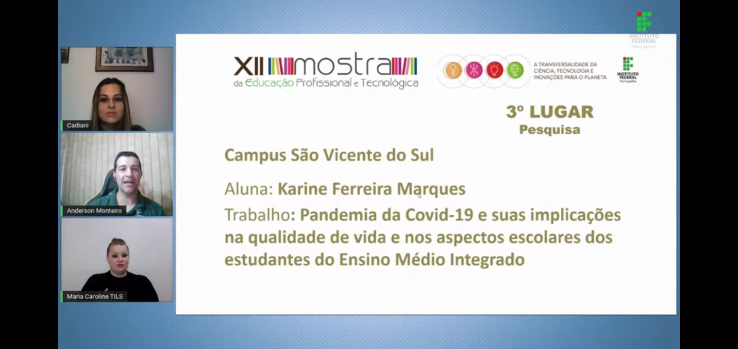 - 3º lugar - “Pandemia da Covid-19 e suas implicações na qualidade de vida e nos aspectos escolares dos estudantes do Ensino Médio Integrado”, da aluna Karine Ferreira Marques e orientação de Gabriela Brum de Deus e Renato Xavier Coutinho.