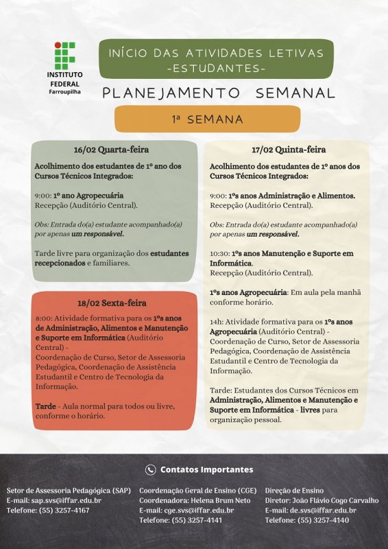 OBS: As novas turmas nos cursos de graduação serão recepcionadas em março, após a divulgação da 1ª chamada e o período de confirmação de vagas (3 a 7 de março/2022). As novas turmas dos cursos subsequentes serão recepcionadas no dia 21/02, ás 14 horas, haja visto que as turmas foram fechadas.