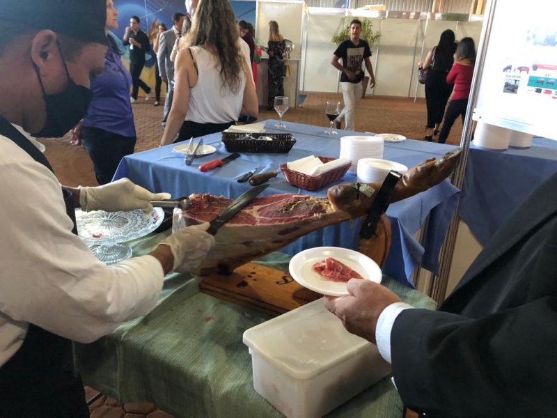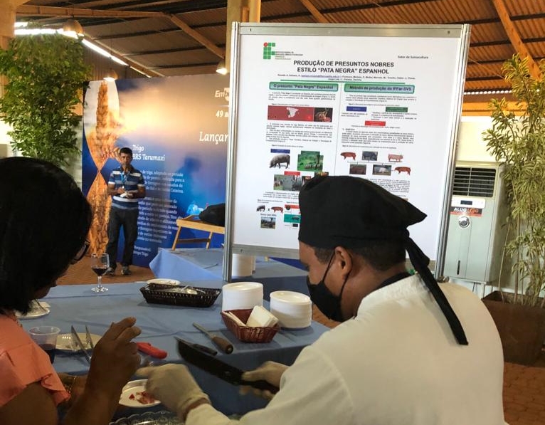 Na última quinta-feira, dia 27 de abril, o Setor de Suinocultura do Instituto Federal Farroupilha - Campus São Vicente do Sul expôs trabalho de pesquisa realizado na fabricação de presuntos nobres na solenidade comemorativa ao 49º aniversário da Embrapa, ocorrido em Brasília/DF. Ao final do evento, foi organizado um coquetel de confraternização com exposição de produtos realizado por parceiros, onde os presuntos do estilo “pata negra” foram degustados. Sob coordenação do profº Adriano Rosado, as peças foram produzidas no Campus SVS com animais de genética oriunda da Embrapa Suínos e Aves.