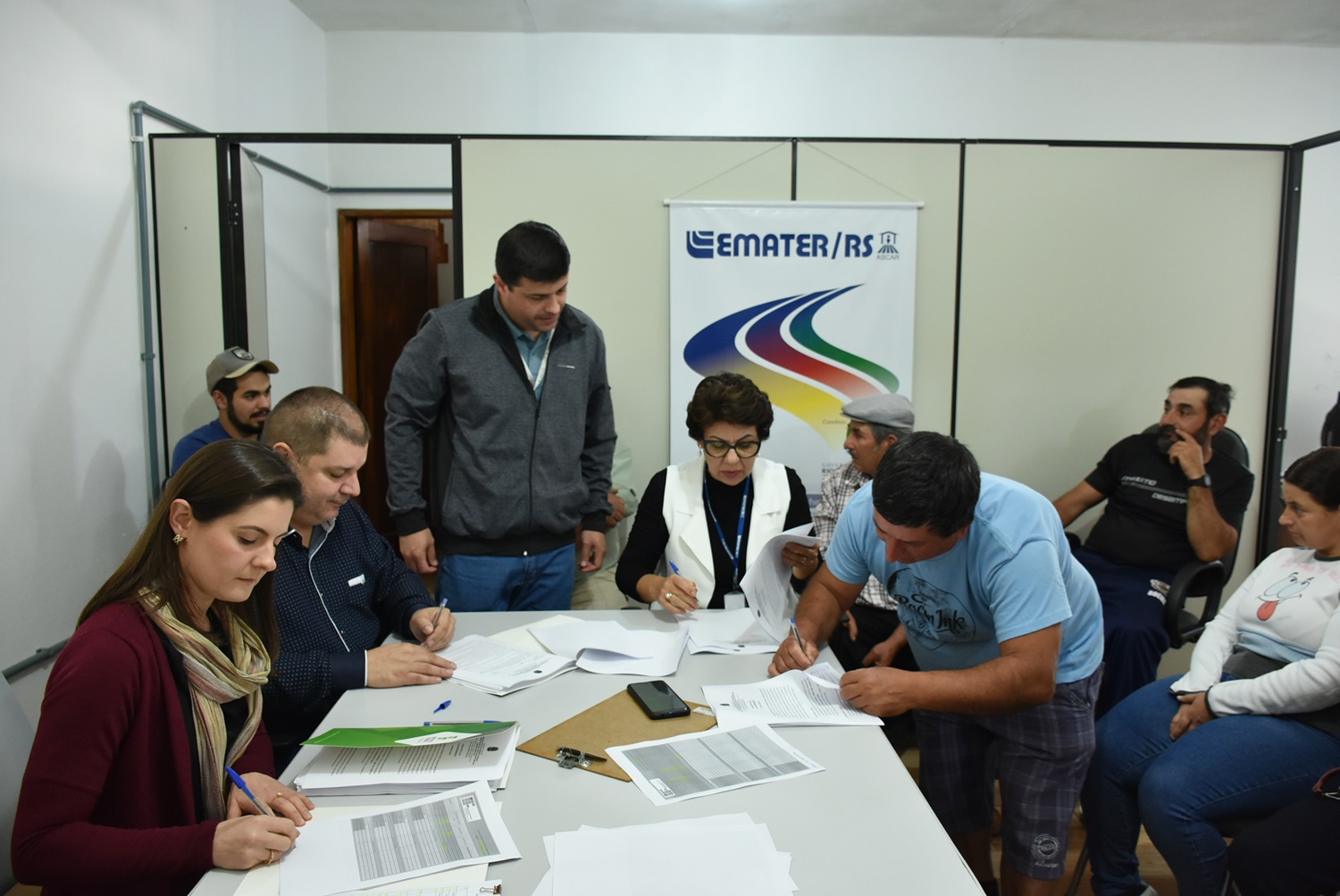 Nesta quinta-feira, dia 10 de agosto, o Instituto Federal Farroupilha - Campus São Vicente do Sul assinou 15 contratos oriundos da Chamada Pública nº 27/2023, que trata da compra de Gêneros Alimentícios da Agricultura Familiar para a Alimentação Escolar e visa atender ao Programa Nacional de Alimentação Escolar (PNAE). O ato de formalização aconteceu no escritório municipal da Emater/RS-Ascar e contou com a presença dos agricultores e das agricultoras selecionados, do diretor geral, prof. Deivid Buttinger Dutra de Oliveira; do diretor de Administração, Gilson Parodes; dos servidores do Setor de Licitação e Contratos, Max Conterato e Gilliard Carillo; da nutricionista Carlise Prevedello; além de Eronita Pereira da Rocha e Jeferson Frasson Zajonz, representantes da Emater/Ascar.