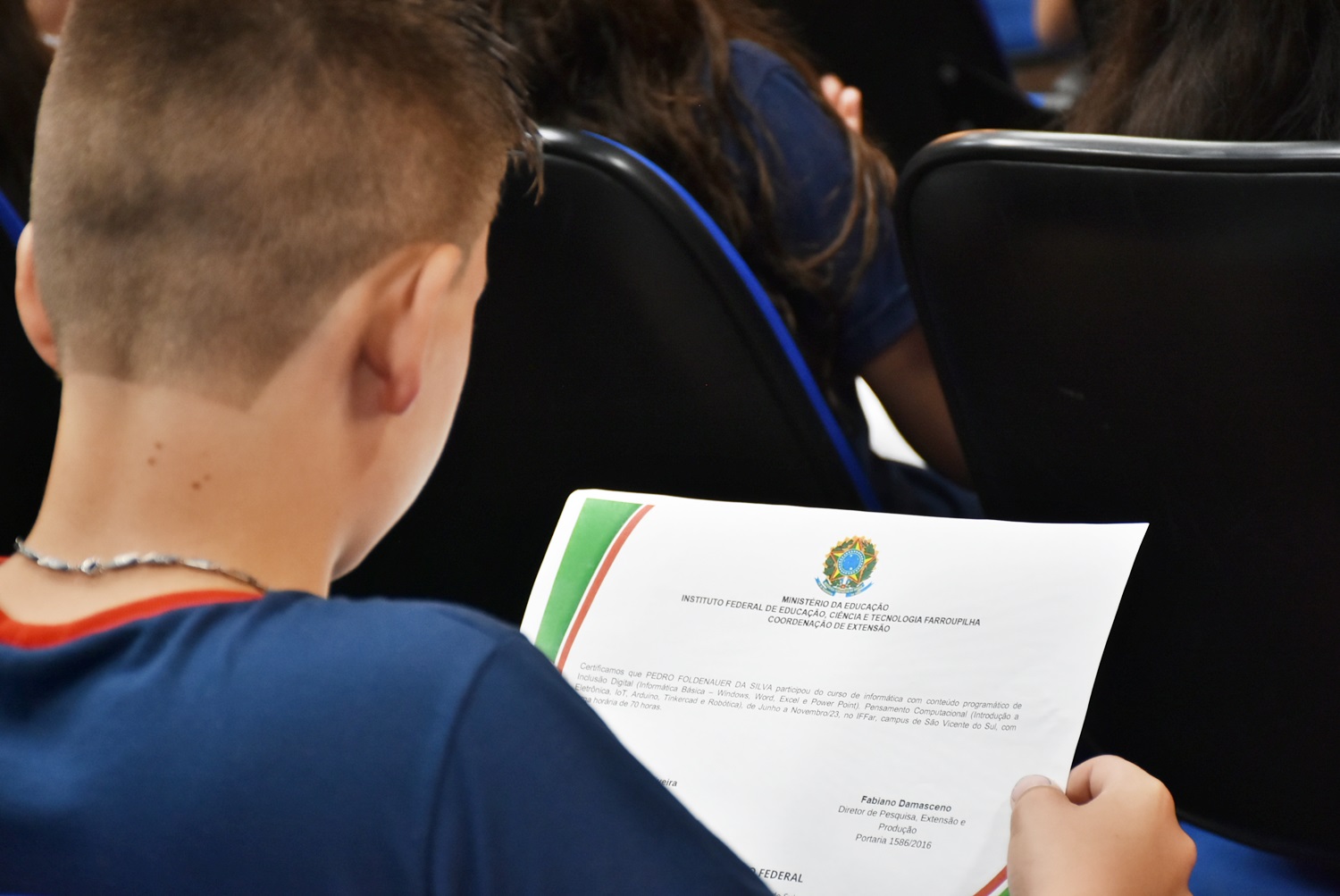 Nesta quarta-feira, 29 de novembro, aconteceu, no Instituto Federal Farroupilha – Campus de São Vicente do Sul, a cerimônia de certificação dos mais de 30 estudantes participantes do Curso de Extensão “Bit de Inserção Social: Escolas e Instituições Inclusivas”.