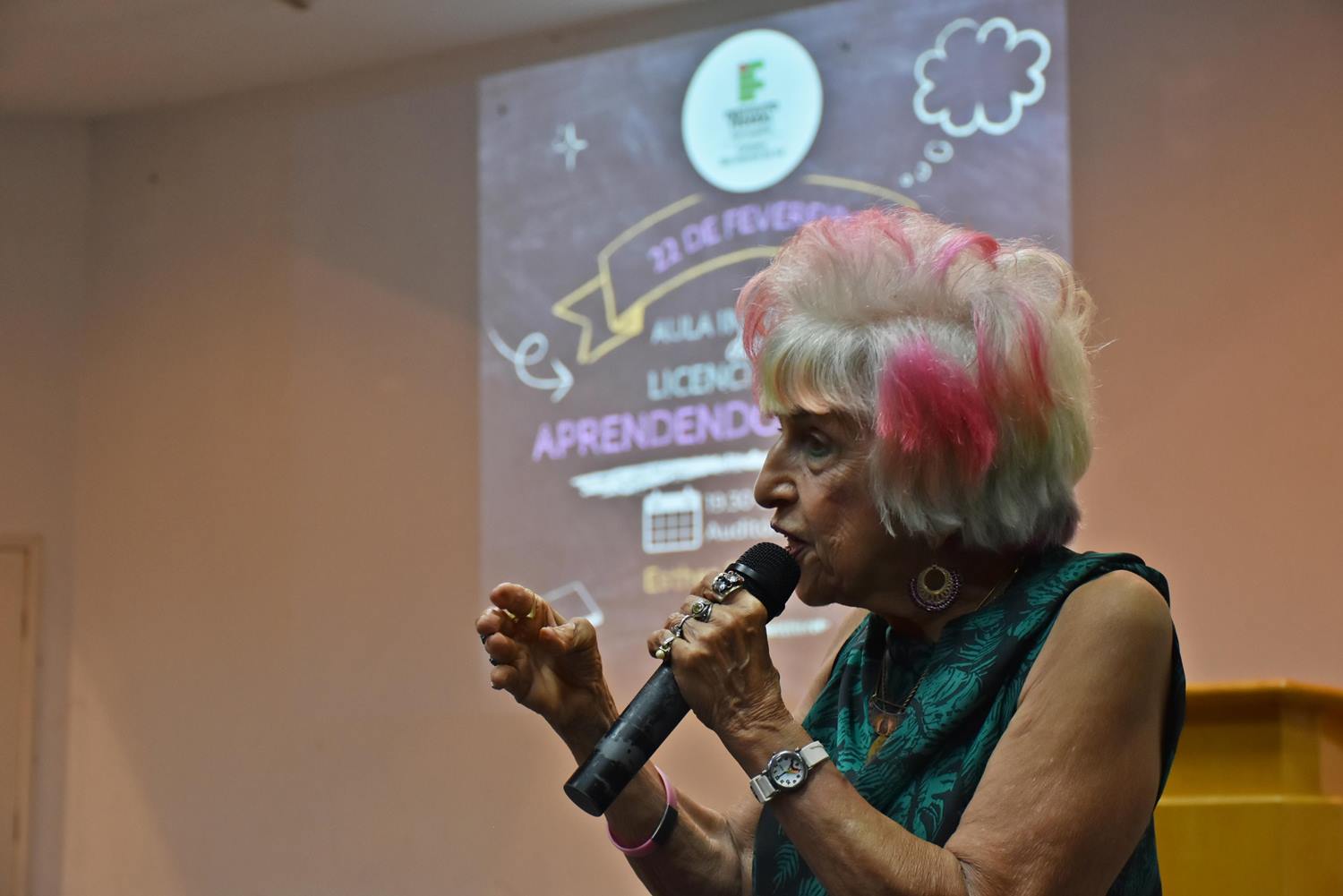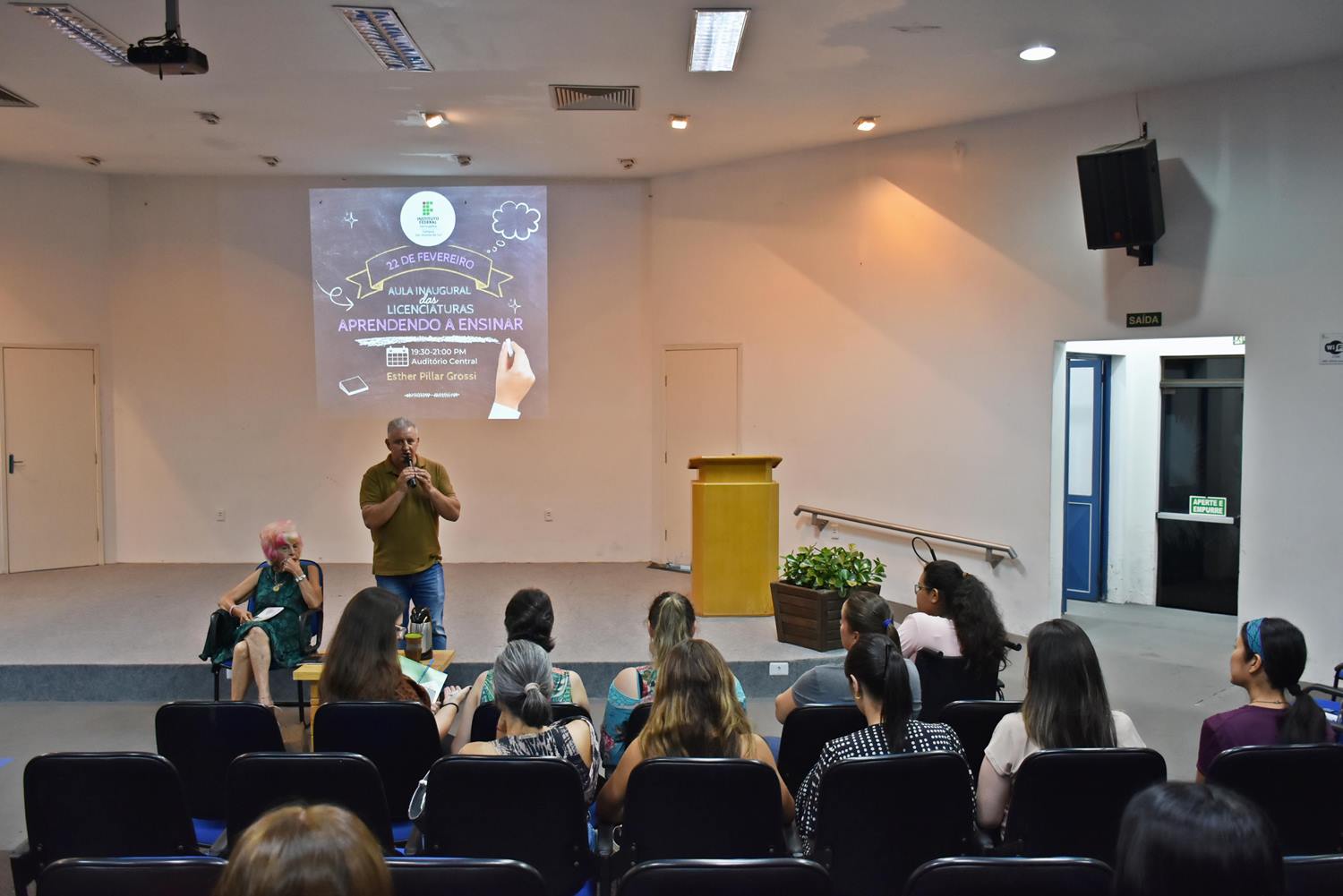 Na noite do dia 22, quinta-feira, ocorreu a aula inaugural das licenciaturas presenciais – Ciências Biológicas e Química. A palestra “Aprendendo a ensinar” foi ministrada pela profª Esther Pillar Grossi, educadora com mais de trinta obras lançadas sobre matemática, processo cognitivo e alfabetização. Também foi deputada federal pelo Rio Grande do Sul e fundadora, em 1970, do Grupo de Estudos sobre Educação, Metodologia de Pesquisa e Ação (GEEMPA), existente até hoje, na cidade de Porto Alegre/RS.
