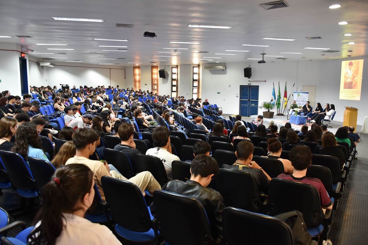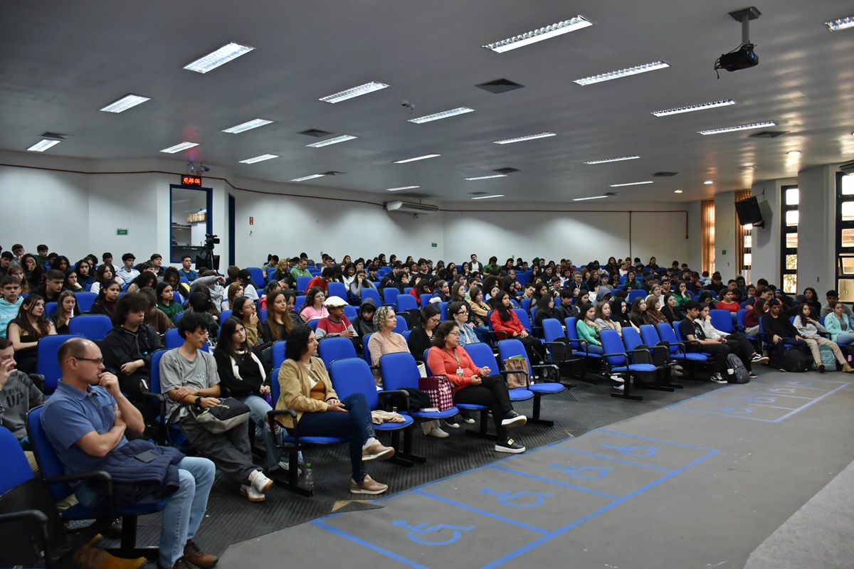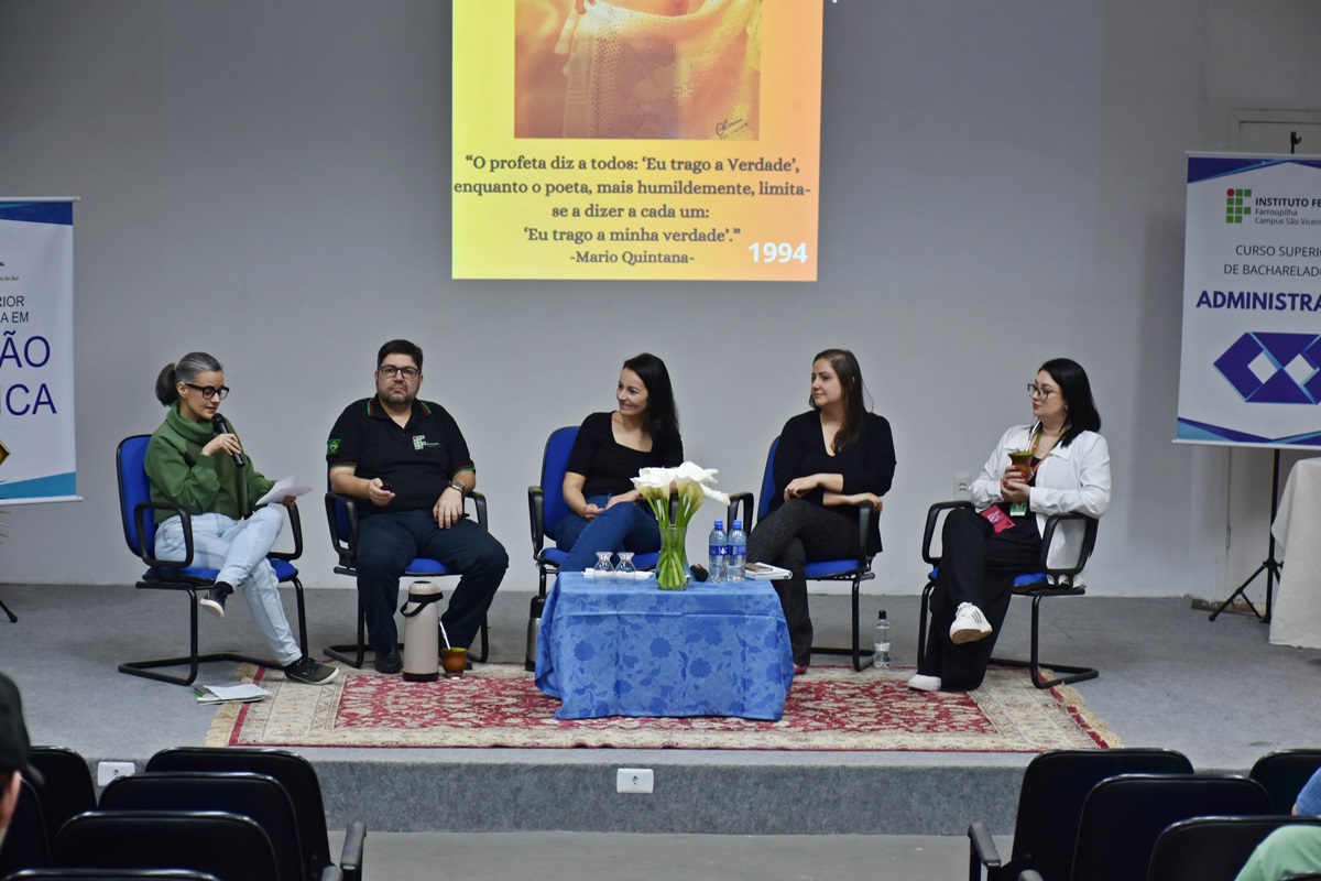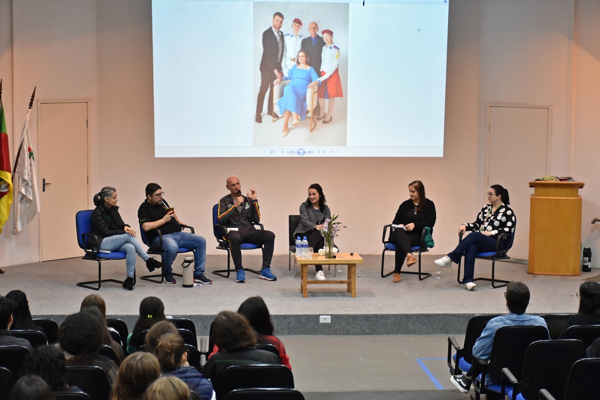 Intitulado "Nossas histórias", o evento ocorreu em dois momentos, um destinado às turmas do 1º ano (09/09) e outro às do 2º ano (11/09). Participaram da conversa os profs. Haury Temp e Alecsson Almeida dos Santos, a prof. Janine Bochi do Amaral e a técnica-administrativa Thais Ferreira Colombo.