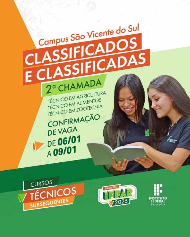 O Instituto Federal Farroupilha - Campus São Vicente do Sul, por meio do Edital nº 003/2025, publica a 2ª chamada dos classificados e classificadas no Processo Seletivo para os Cursos Técnicos Subsequentes. A confirmação de vaga acontece no período de 6 a 9 de janeiro de 2025.