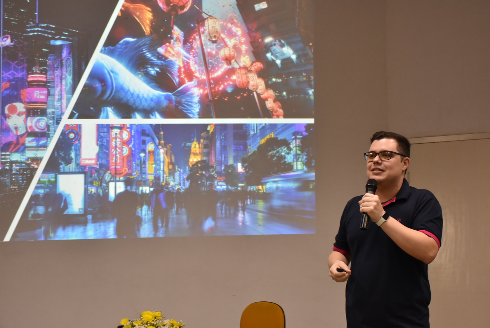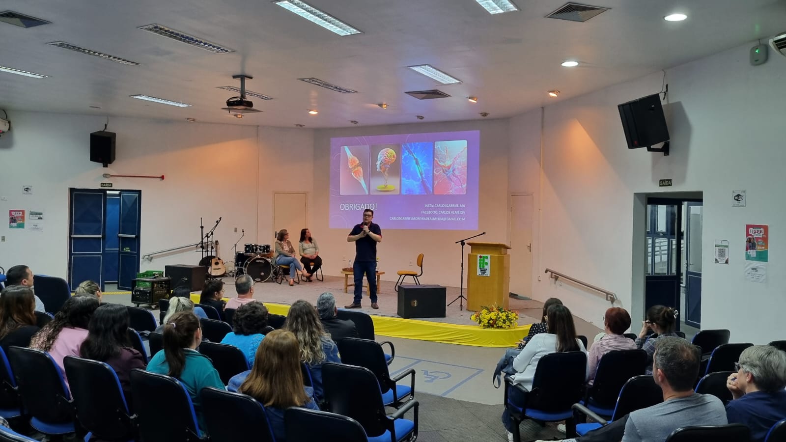 À noite, a atividade foi direcionada aos cursos superiores, com a palestra "Cérebro em Sobrecarga: Neurociência da Ansiedade e Vida Digital". Prof. Carlos abordou de forma aprofundada como o uso excessivo de dispositivos digitais pode alterar padrões de atenção, memória e regulação emocional, além de explorar estratégias práticas para reduzir a sobrecarga cognitiva e prevenir sinais de ansiedade. Ele também discutiu a influência da tecnologia no desenvolvimento de hábitos de estudo e na gestão do estresse, adaptando sua fala especialmente para futuros professores e para o contexto educacional. A mediação foi feita por Francine Cassol Prestes, enfermeira, e pela profª Janine Amaral.