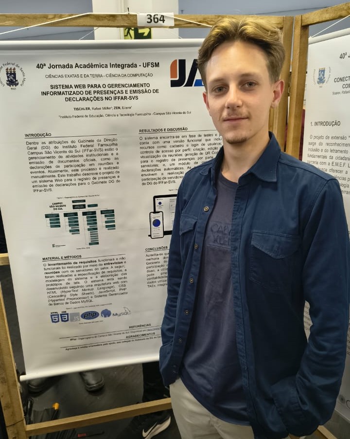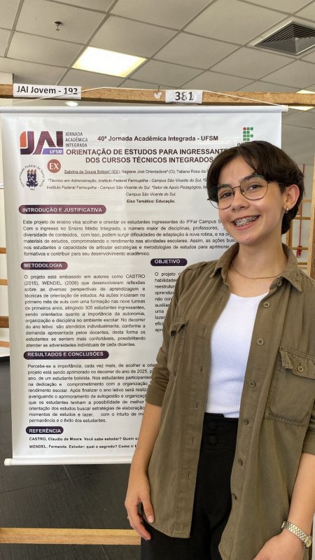 De 3 a 7 de novembro, acadêmicos de diversos cursos do Campus São Vicente do Sul participaram da Jornada Acadêmica Integrada (JAI) da Universidade Federal de Santa Maria (UFSM), evento científico que reúne apresentações de trabalhos de pesquisa, ensino, extensão e inovação desenvolvidos por estudantes de instituições da região.