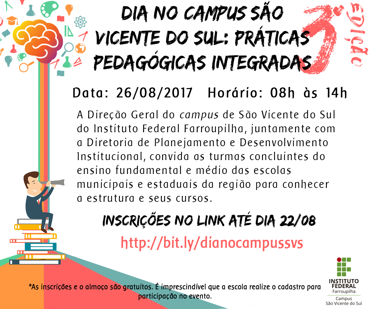 No dia 26 de agosto acontecerá a 3ª Edição do Dia no Campus São Vicente do Sul: Práticas Pedagógicas Integradas. O evento, com programação das 8 às 14h, tem por objetivo apresentar as práticas pedagógicas integradas, organizadas pelos alunos dos cursos técnicos integrados da instituição, e também as oportunidades que o campus oferece, por meio das atividades e projetos desenvolvidos.
