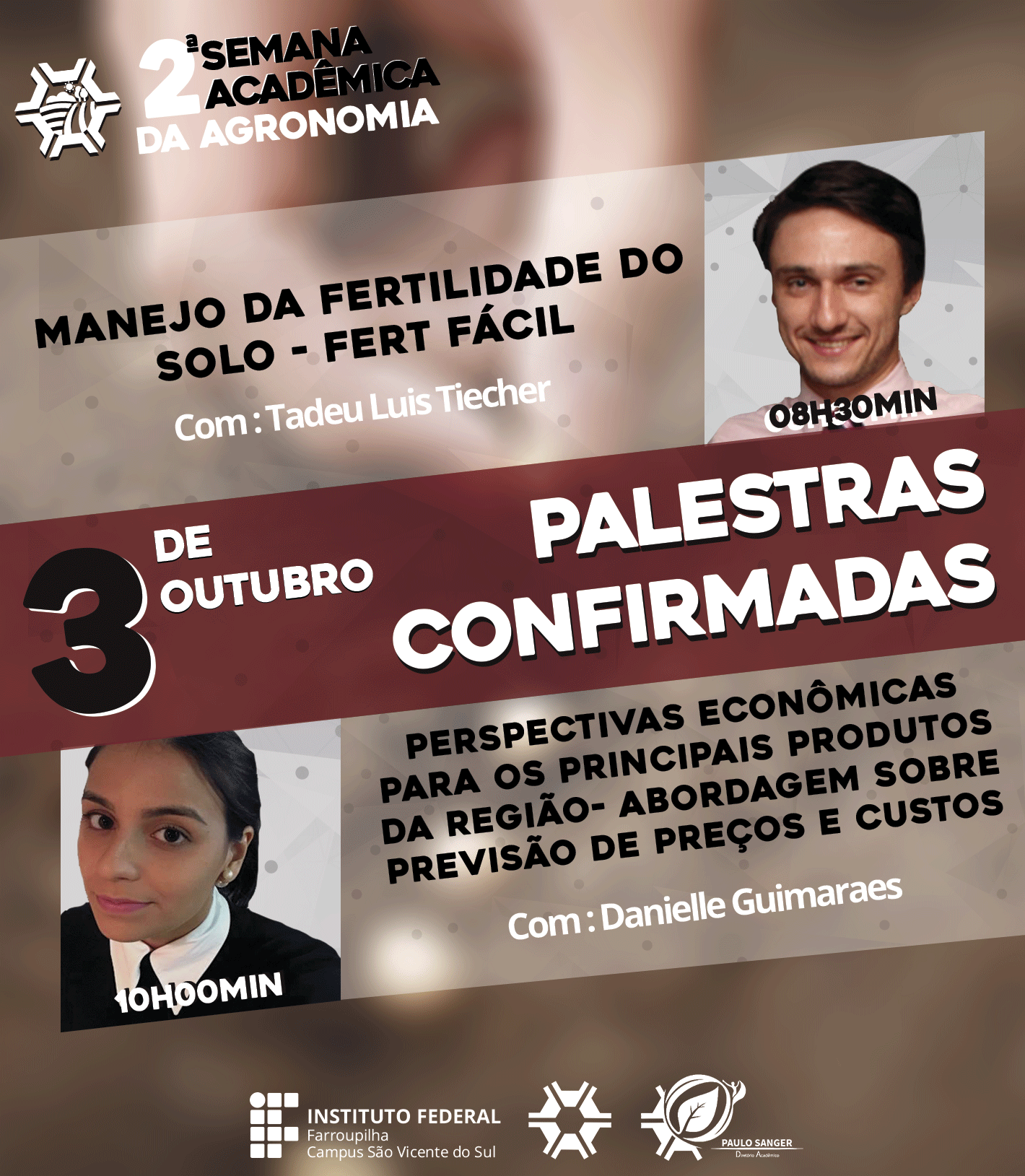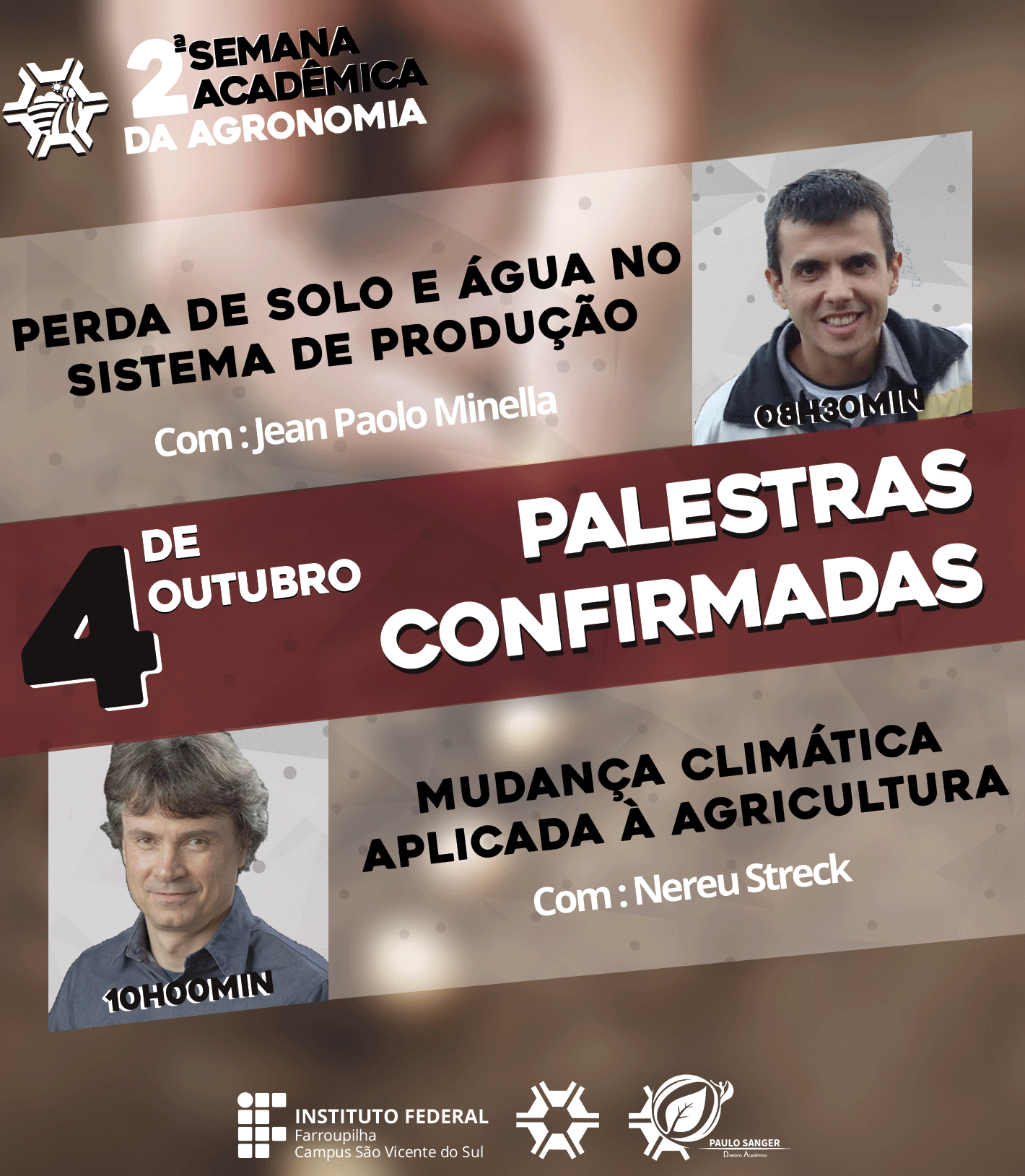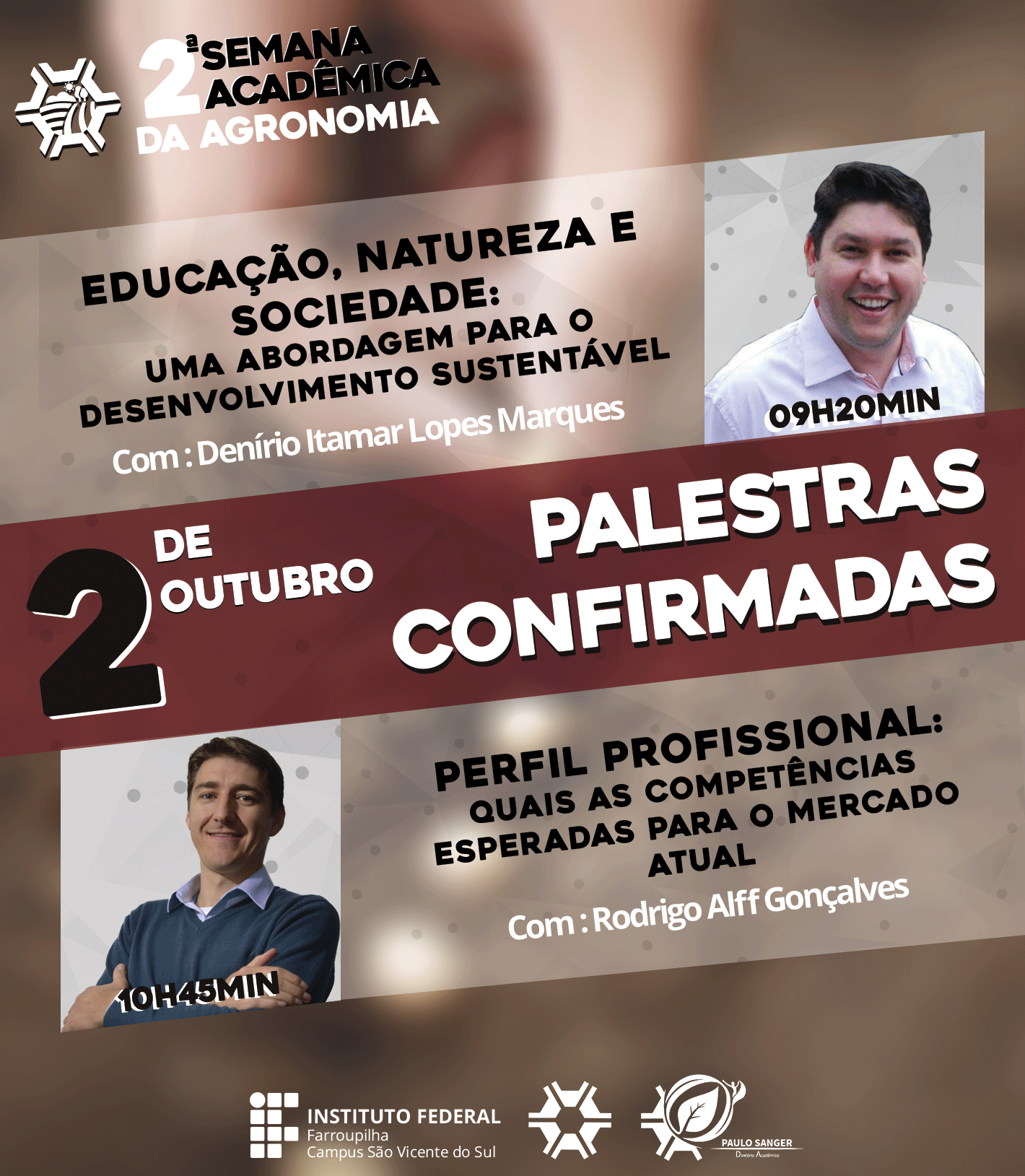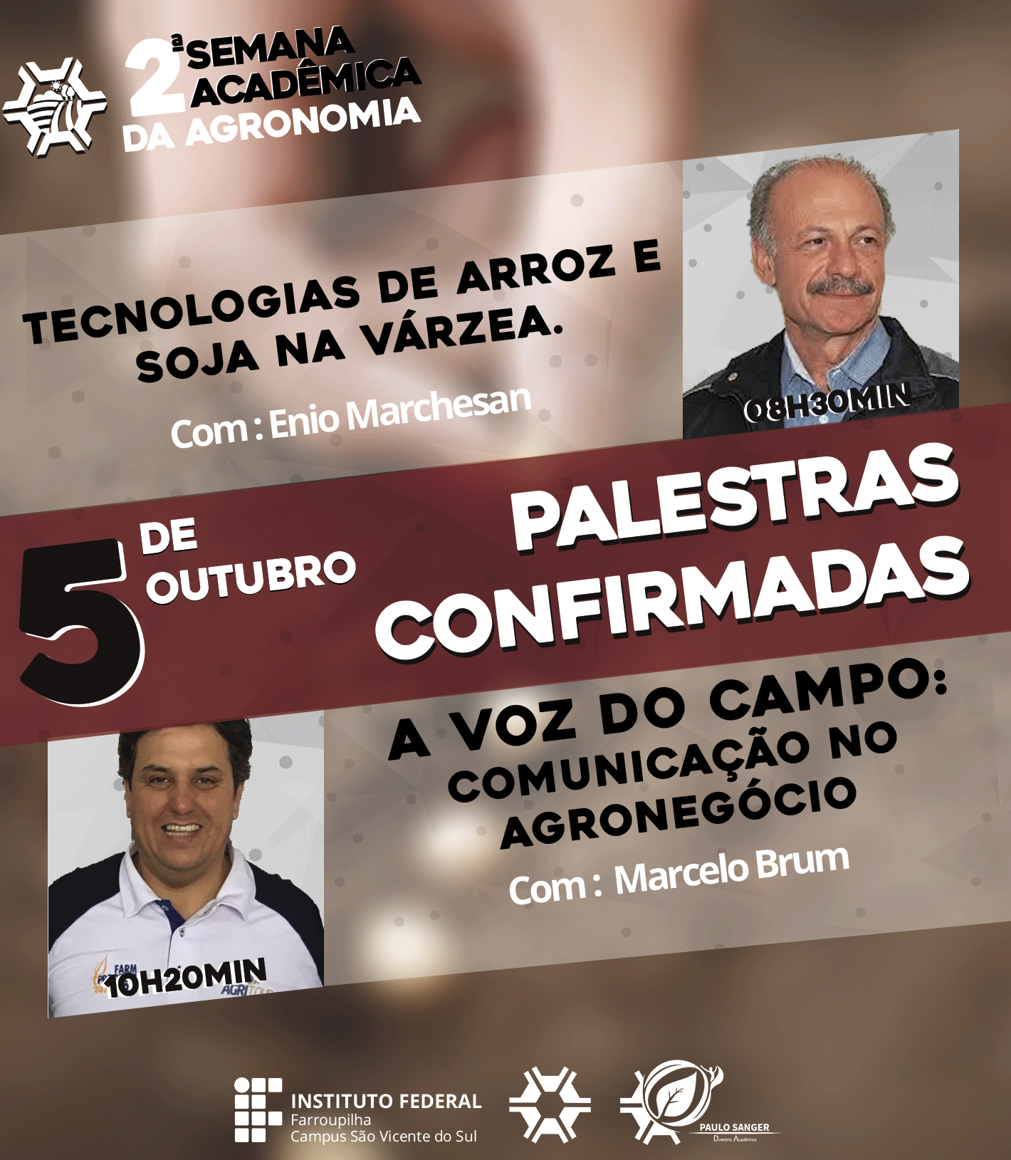 Em outubro, nos dias 2, 3, 4, 5,  acontecerá no Salão azul do Instituto Federal Farroupilha campus São Vicente do Sul a 2º Semana Acadêmica da Agronomia, com tema proposto "Semeando ideias para uma nova agricultura". Onde Já podemos verificar qual será a programação.