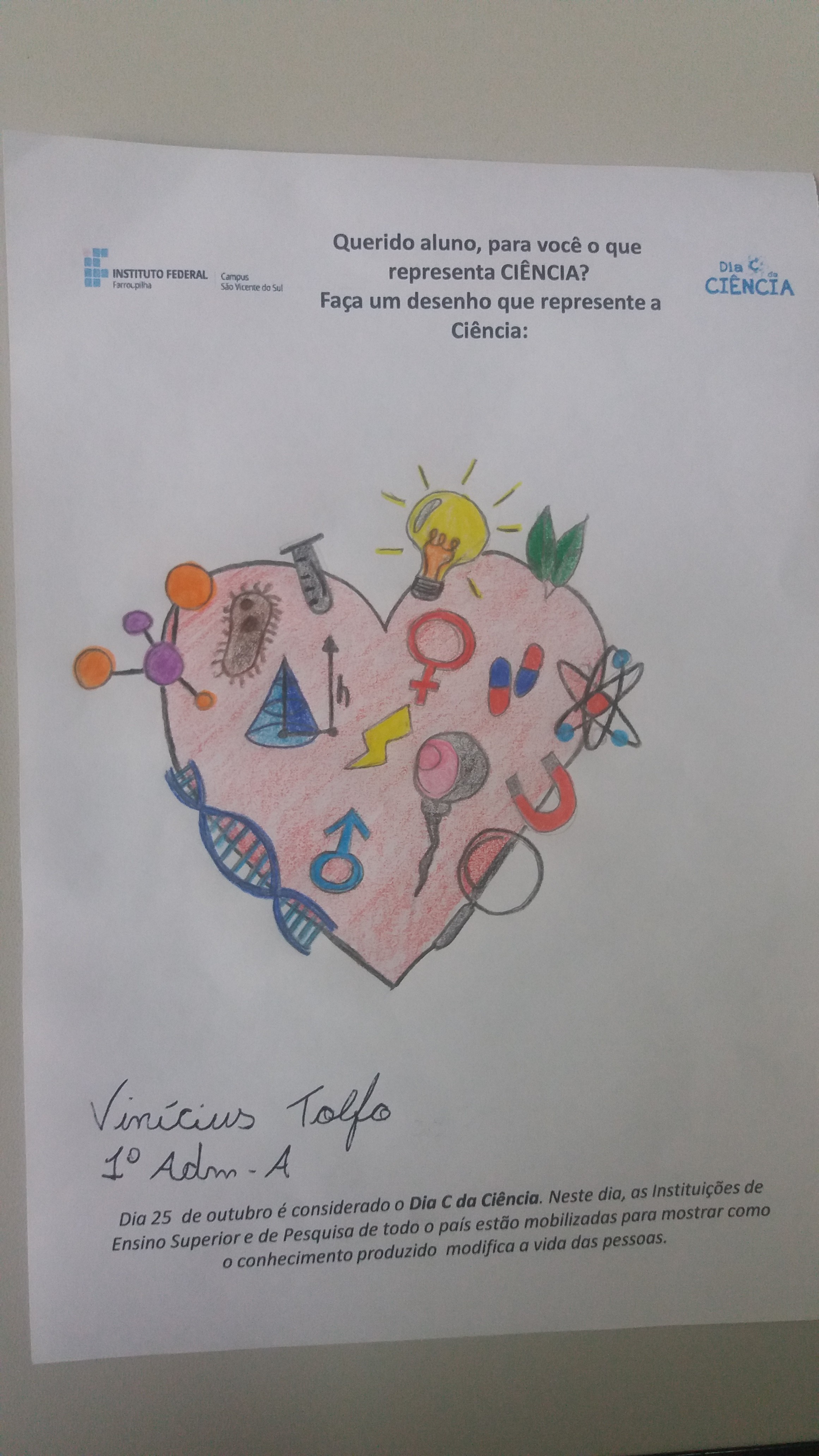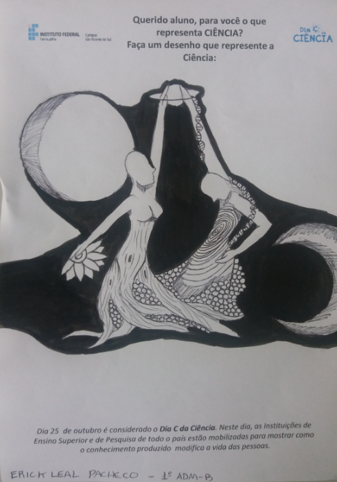 As ações do Campus estimularam a participação dos discentes na representação do que significa Ciência, onde os mesmos tiveram a oportunidade de demonstrar se potencial artístico. As representações foram analisadas pela DPEP, considerando a abrangência do tema, originalidade e criatividade, garantindo uma premiação para os dois trabalhos mais significativos. Dentre os trabalhos submetidos, os que mais se destacaram foram: Erick Leal Pacheco – 1º ADM B, Vinícius Tolfo – 1º ADM A, Luana Sperling Santana – 2º ADM.