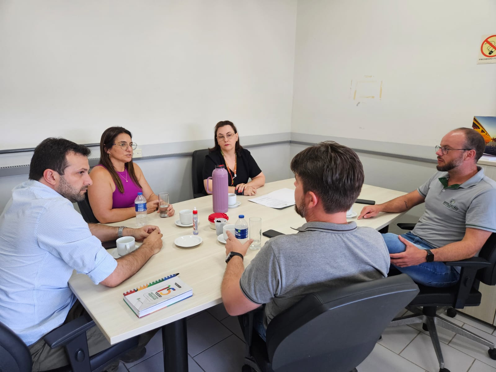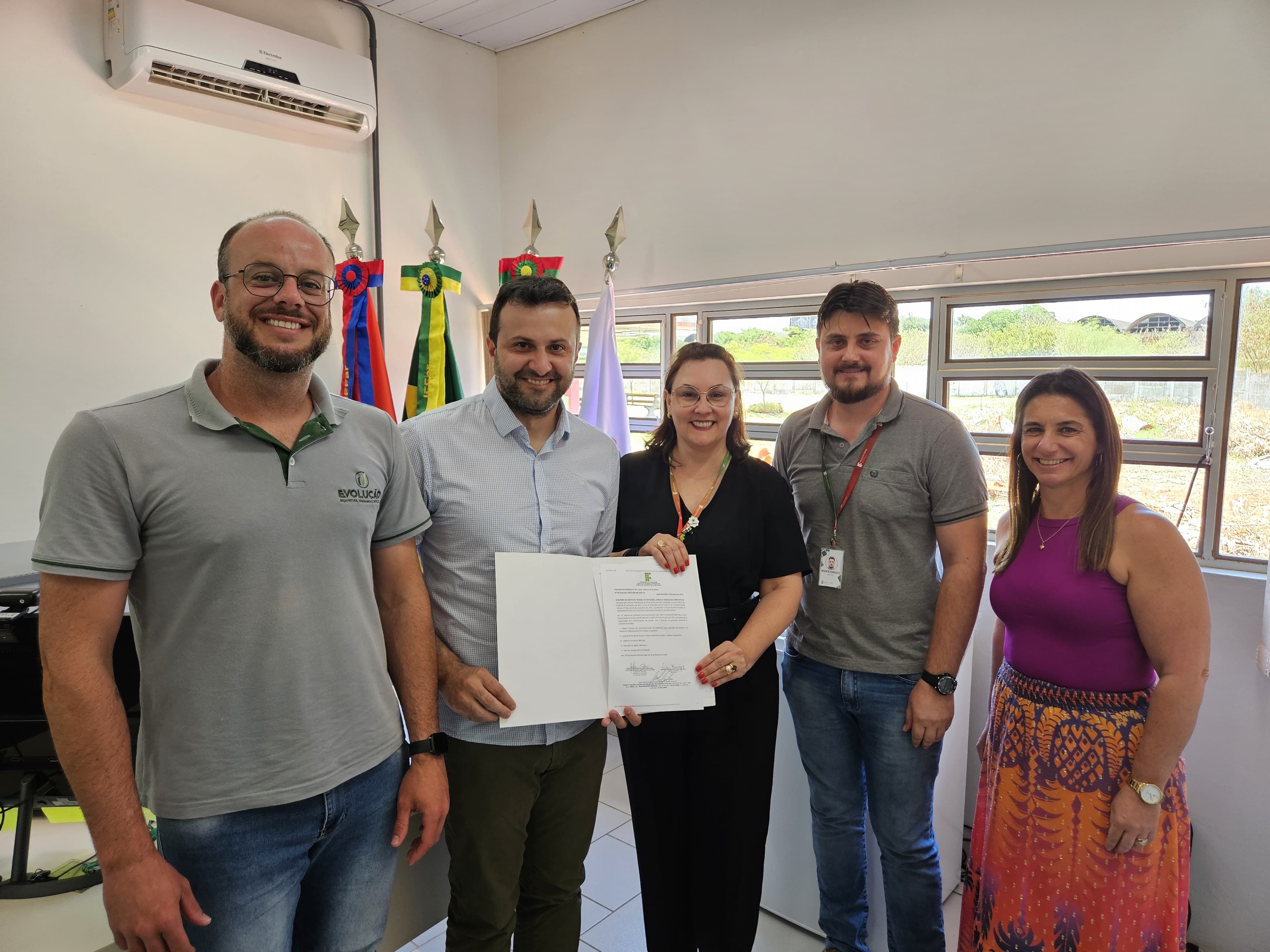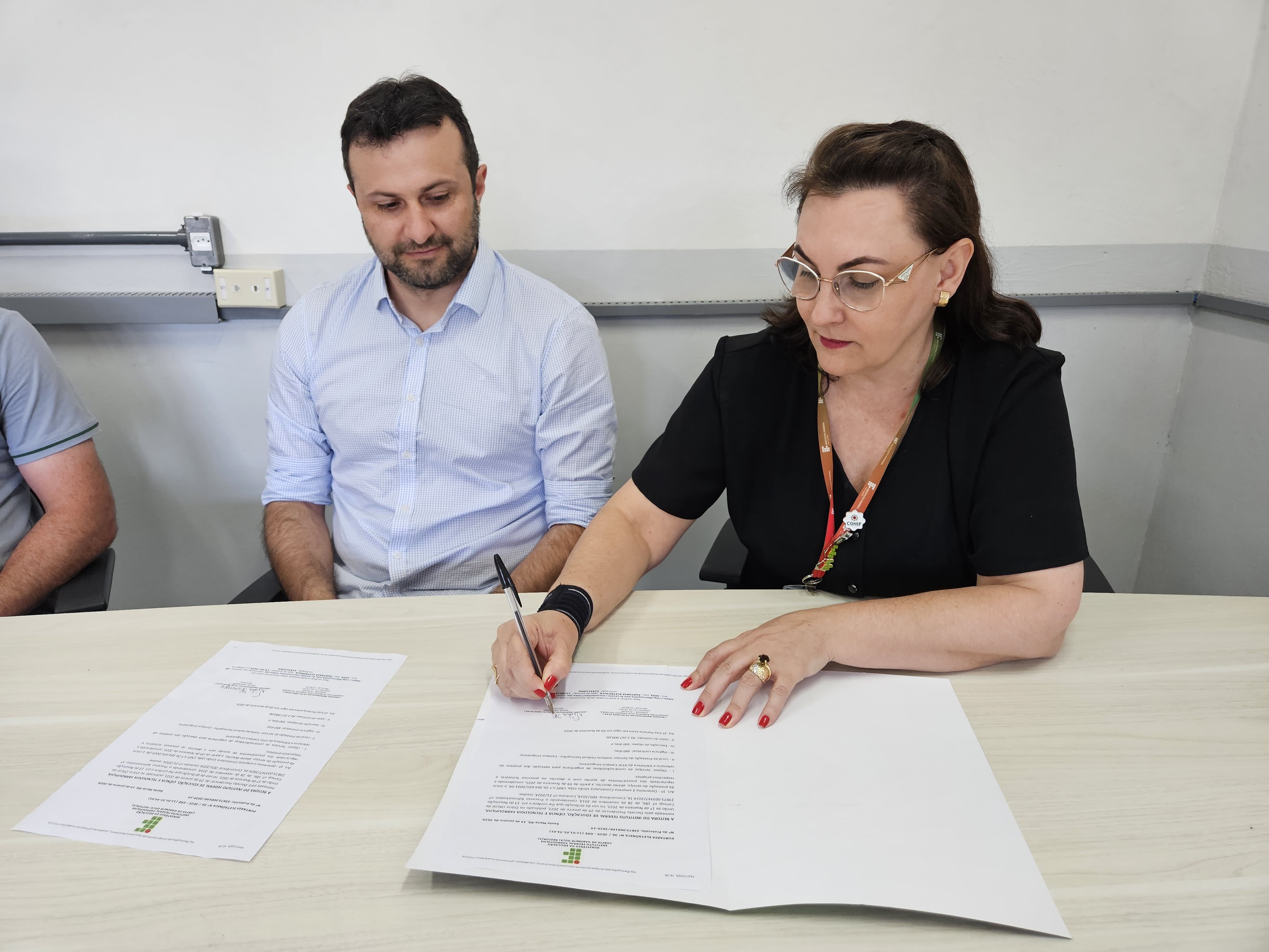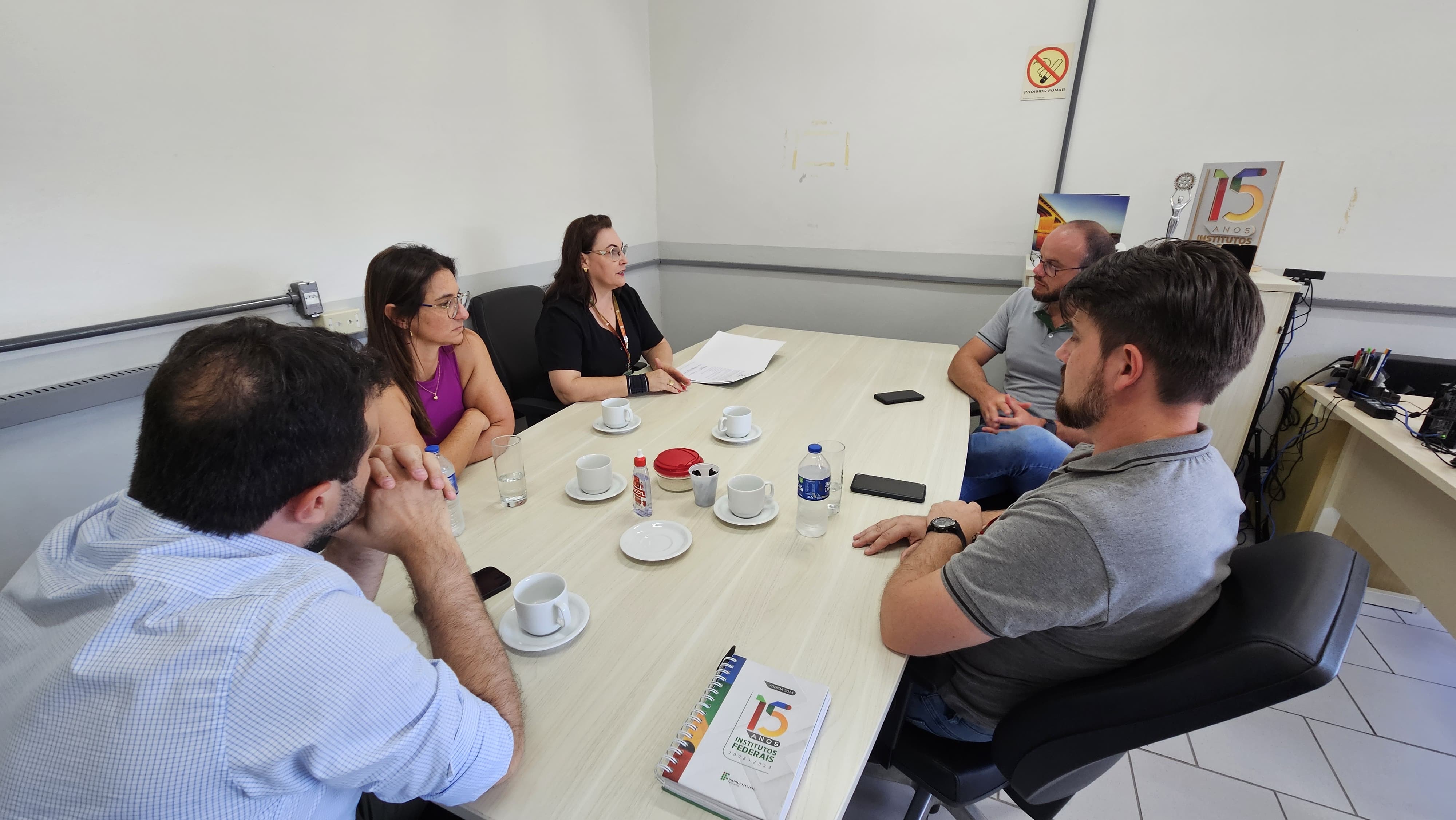 A cerimônia de assinatura da portaria reuniu a reitora, professora Nídia Heringer; o diretor-geral do campus, Jhonathan Alberto dos Santos Silveira; Wagner Fernandes, engenheiro responsável pela fiscalização técnica; Fabíola Machado, arquiteta do IFFar; e Marcelo Grabin, representante da empresa executora do projeto.
