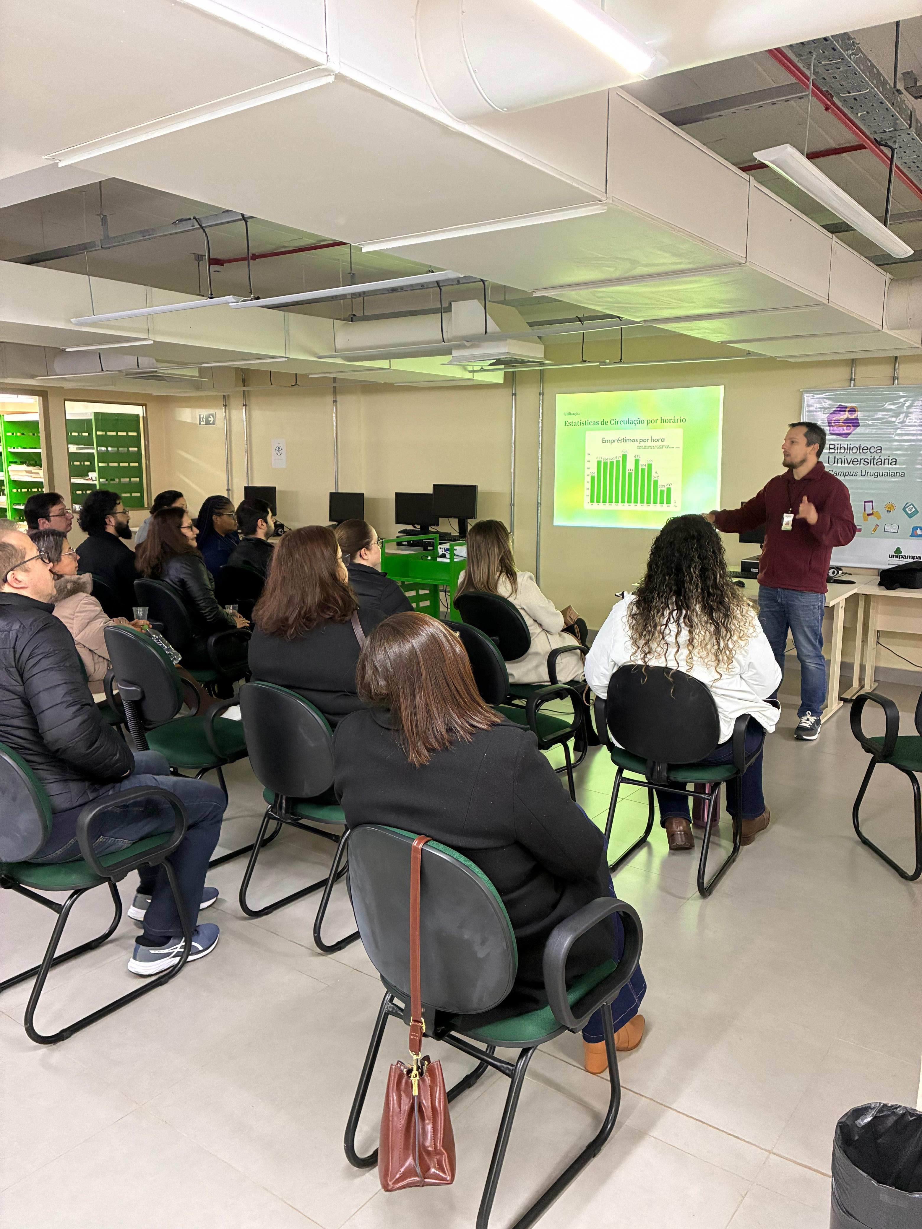 Aconteceu entre os dias 4 e 6 de agosto, no Campus Uruguaiana, o VII Fórum das Bibliotecas e Arquivos do IFFar. O evento que acontece anualmente reuniu os Bibliotecários, os Auxiliares de bibliotecas e Arquivistas. O objetivo do evento é compartilhar saberes e vivências de cada biblioteca, além de discutir questões pertinentes a Gestão das unidades. Este ano foi a vez de Uruguaiana sediar o evento e foi importante conhecer a rotina de trabalho das bibliotecas da cidade que também fazem parte da rede Pergamum. Destacaram-se no Fórum a biblioteca da Escola Marista Santana, na qual a Bibliotecária Leonise Loose e as Assistentes de biblioteca Helena Martins e a Luciana Guimarães apresentaram o sistema Pergamum e as atividades de incentivo a leitura que realizam; A formação com a CAPNE, ministrada pela Coordenadora Sandra Machado; E a palestra sobre Bibliotecas Universitárias e inteligência artificial na pesquisa acadêmica, explanada pela Bibliotecária do Colégio Pedro II, Cristiane Almeida Rodrigues. Além das apresentações de trabalhos dos servidores: O Arquivista Magnus Machado, apresentou o trabalho que desenvolve relacionado a classificação, limpeza, guarda documental, controle de umidade e preservação; nesse seguimento, o Bibliotecário Frederico Cutty apresentou seu Projeto de incentivo a leitura; O Bibliotecário Josef Aquino apresentou o trabalho sobre biblioteca digital; A Auxiliar de biblioteca, Lurdes Mauí apresentou o produto de sua dissertação, intitulado as contribuições da biblioteca como guardiã da memória e do acervo; A Bibliotecária Daniela D’Campora e as Auxiliares de biblioteca Liliam Paranhos e Isabela Lima apresentaram o projeto Biblioteca em Ação. E, por fim, aconteceu a apresentação da Pesquisa realizada no Arquivo Municipal de Uruguaiana, pelo Professor e estudante de Arquivologia Tiago Lucho Rangel. O evento foi finalizado com a visita técnica e apresentação das rotinas de trabalho na biblioteca da Unipampa Campus Uruguaiana, ministrada pelos Bibliotecários Marcos Anselmo e Fernanda Rocha. O VII Fórum foi organizado pelas Bibliotecárias Kauana Rodrigues Amaral e Cristiane Silva Teixeira, com a colaboração dos servidores Crislaine de Paula Espindola, Natthan Ruschel e Maria Rita Rosa da Silva. Agradecemos aos estudantes Maria Eduarda Martines e Verlei Tedy pela apresentação artística e também agradecemos as Bibliotecárias Michele Fernanda Silveira e Carmem Elisa Magalhães que atuaram como mediadoras durante o VII Fórum das Bibliotecas e Arquivos.