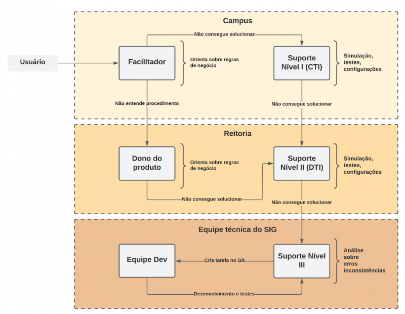 - No caso de erro procedente e confirmado como falha do sistema pelo Suporte Nível I ou pelo dono do produto, os procedimentos deverão ser documentados e, em conjunto ao documento produzido pelo facilitador, encaminhados ao Suporte Nível II.