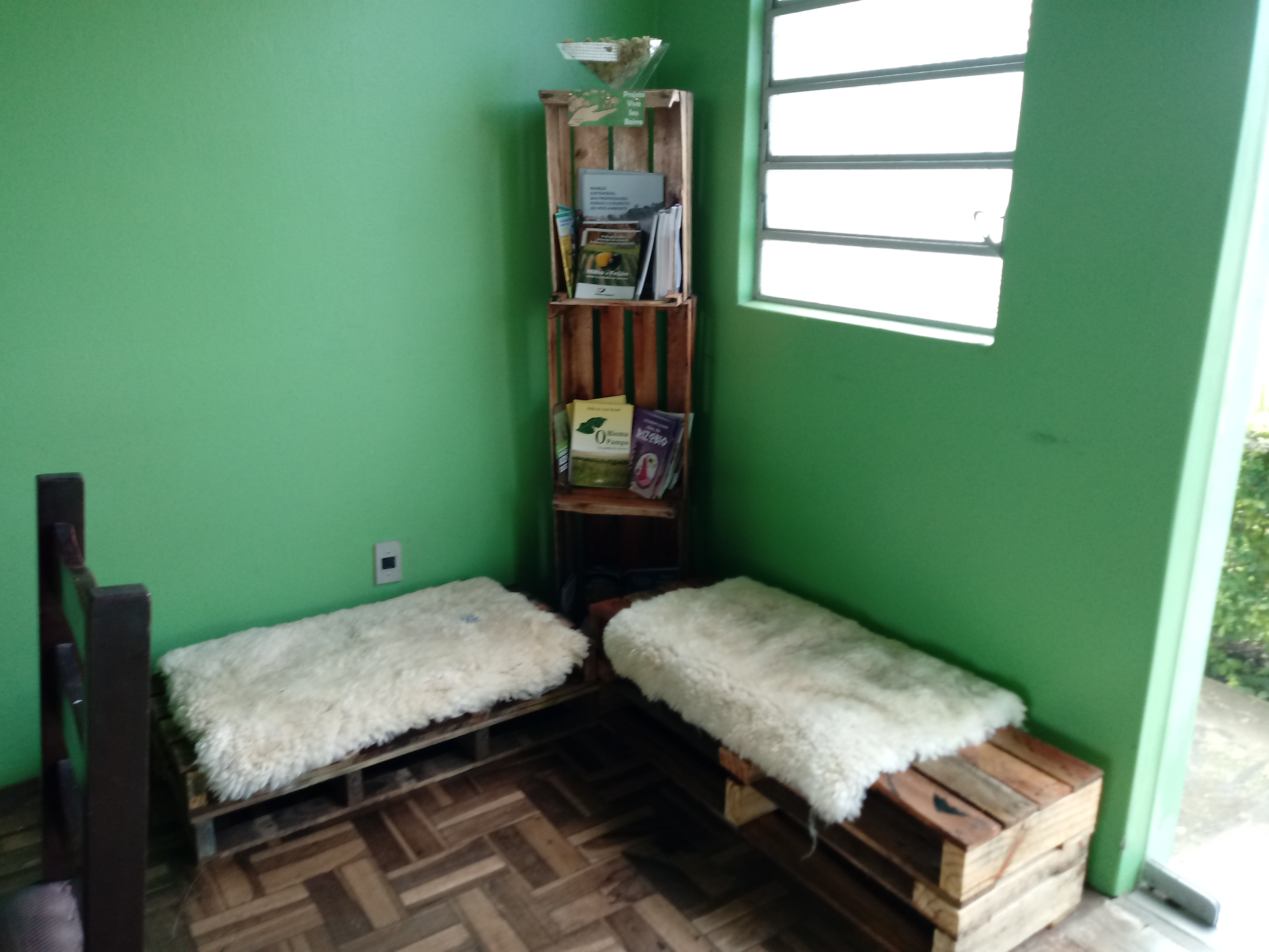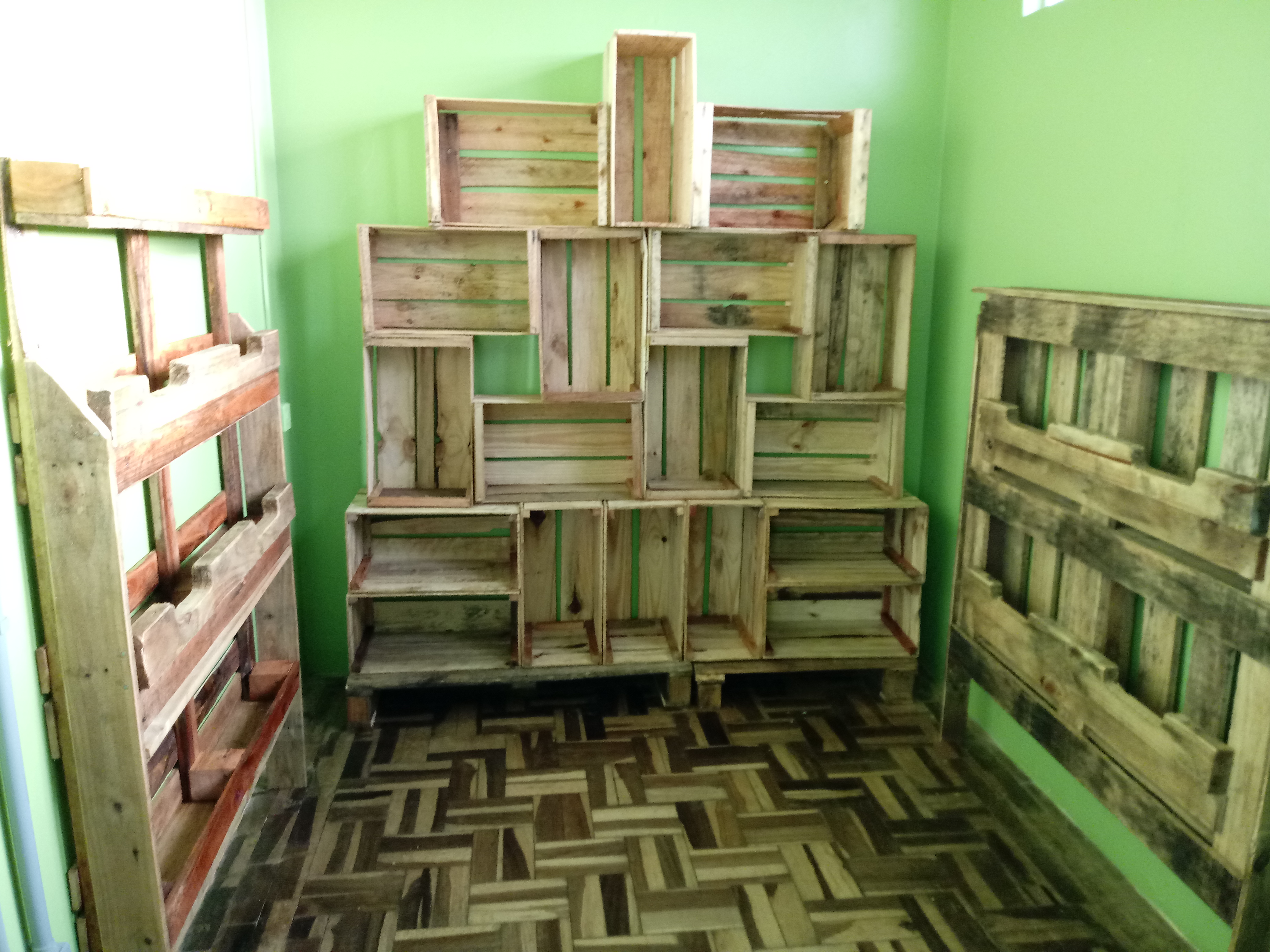 A biblioteca foi construída no Centro de Referência São Gabriel com caixas de frutas e paletes
