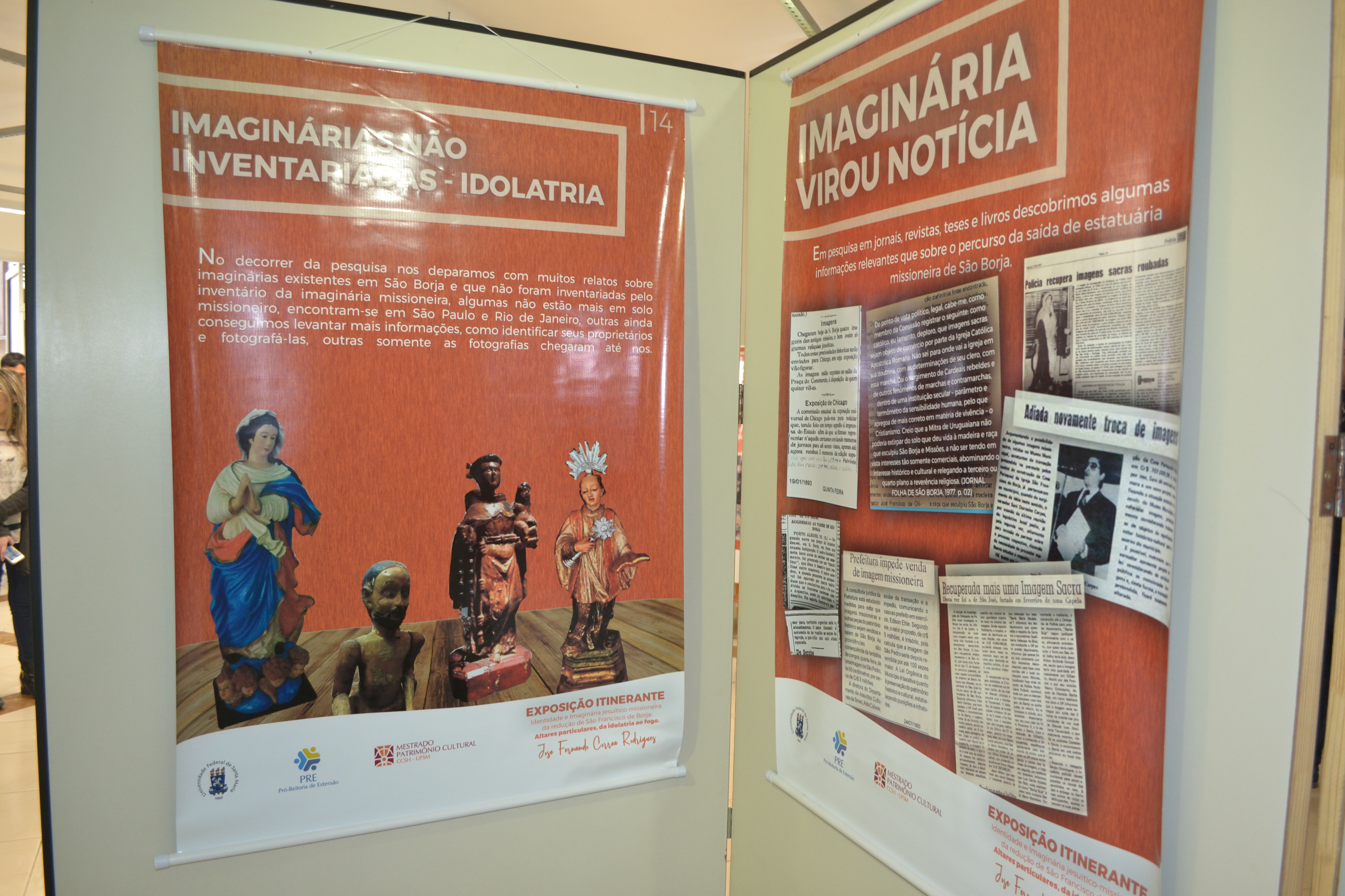 Hoje (27), às 8h30, foi realizada a abertura da exposição itinerante "Identidade e imaginária jesuítico-missioneira da redução de São Francisco de Borja: altares particulares, da idolatria ao fogo", no hall da Reitoria. A exposição, de autoria de José Fernando Corrêa Rodrigues, ficará aberta ao público até o dia 11 de junho.