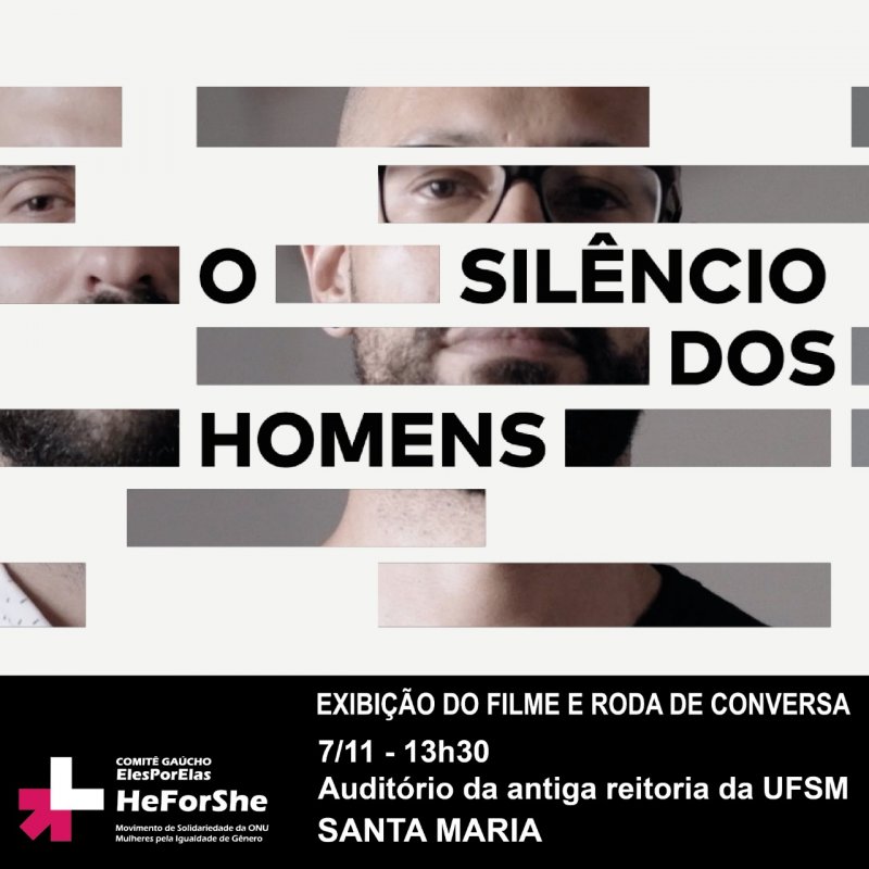 O IFFar, em parceria com a Universidade Federal de Santa Maria (UFSM) e o Comitê Gaúcho do movimento ElesPorElas (HeForShe Brasil) vai exibir o documentário 'O Silêncio dos Homens'. A exibição ocorre nesta quinta-feira (7), às 13h30, no auditório da antiga reitoria da UFSM.