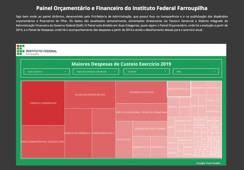 O Instituto Federal Farroupilha agora disponibiliza um painel para visualização simplificada de informações acerca das despesas da instituição nos últimos anos. A ferramenta foi construída pela Pró-Reitoria de Administração (PROAD) por meio da plataforma Google Data Studio.