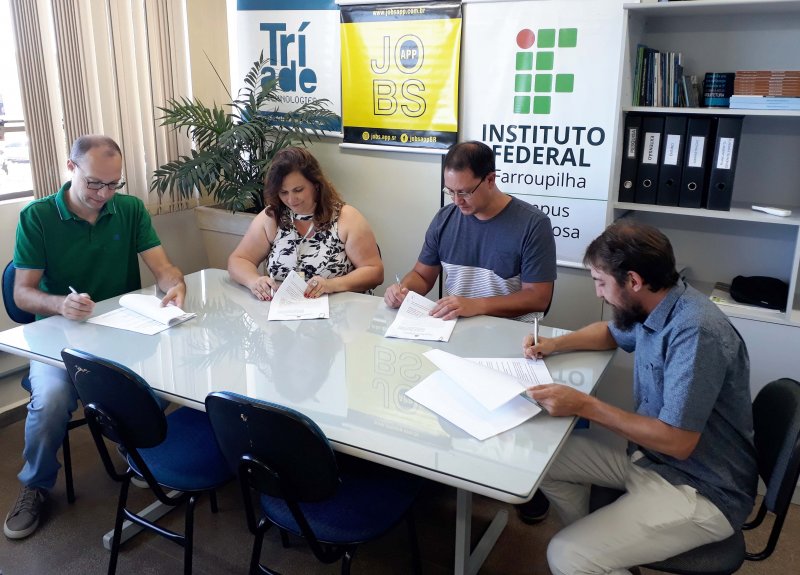 Participaram da reunião de formalização da assinatura do contrato, realizada no gabinete da direção, a diretora-geral substituta, professora Analice Marchezan; o coordenador do Núcleo de Inovação Tecnológica – NIT, professor Rodrigo Soder; e os representantes da empresa Triade Technologies, Ricardo Cademartori e Ike Becker. A empresa tem como produto principal o JobsApp, uma plataforma digital para quem procura ou oferta serviços como encanador, mecânico, eletricista, pedreiro, dog-walker, costureiro, limpador de piscina, etc.