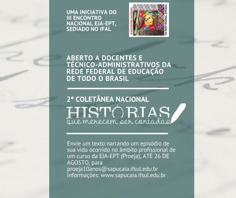 Para participar, os interessados devem enviar um texto narrando um episódio da sua vida ocorrido no âmbito profissional de um curso da EJA – EPT (Proeja) até o dia 26 de agosto. O texto deve ser enviado para o e-mail Este endereço de email está sendo protegido de spambots. Você precisa do JavaScript ativado para vê-lo.. A narrativa pode ser elaborada de forma individual ou em dupla, em prosa ou em poesia. Cada campus pode enviar até três histórias, de diferentes autores.