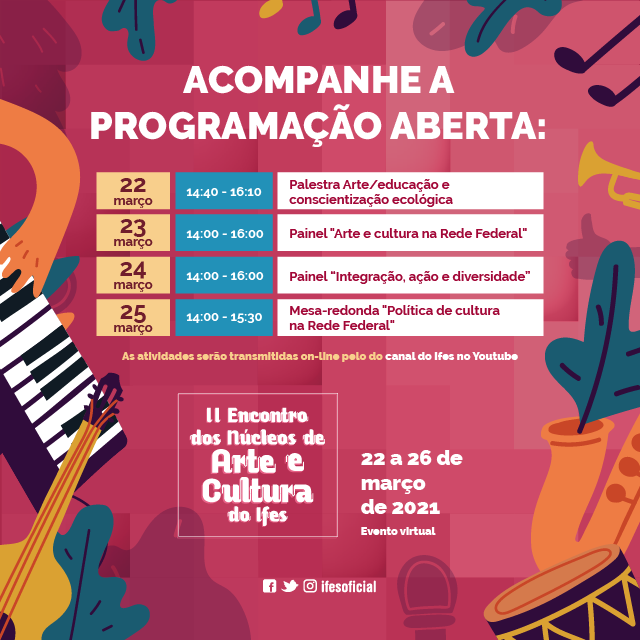 Nesta terça-feira (23), o Núcleo de Arte e Cultura (NAC) do IFFar vai integrar um painel durante o II Encontro dos Núcleos de Arte e Cultura do Instituto Federal do Espírito Santo (Ifes). A atividade é aberta ao público e será transmitida pelo YouTube, das 14h às 16h.