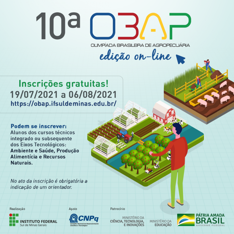 As inscrições para a 10ª edição da Olimpíada Brasileira de Agropecuária (OBAP) estão abertas até o dia 06 de agosto. Estudantes dos cursos técnicos integrados, concomitantes e subsequentes podem se inscrever de forma gratuita na competição, que ocorrerá de forma online.