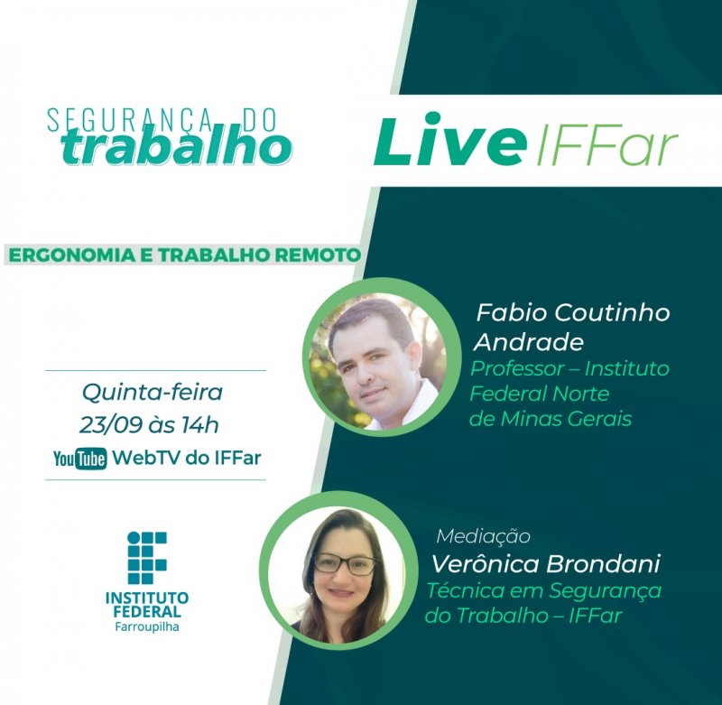A live será ministrada pelo professor Fabio Coutinho Andrade, do Instituto Federal do Norte de Minas Gerais. A mediação será feita pela técnica em segurança do trabalho do IFFar, Verônica Brondani.
