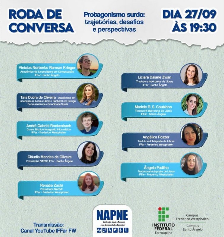 A atividade integra o projeto de ensino “Conhecendo os Núcleos Inclusivos no IFFar”, idealizado pelo NAPNE - Campus Santo Ângelo. Participam da atividade o estudante do curso de Licenciatura em Computação do Campus Santo Ângelo, Vinicius Krieger, a acadêmica do curso de Licenciatura em Letras/Libras, bacharel em Design e representante da comunidade surda, Taís Dutra de Oliveira, o estudante do curso técnico integrado em Informática do Campus Frederico Westphalen, André Gabriel Rockenbach, a presidente do NAPNE – Campus Frederico Westphalen, Renata Zachi, e a presidente do NAPNE – Campus Santo Ângelo, Cláudia Mendes de Oliveira. A live irá contar com a interpretação em Libras das servidoras Liciara Zwan, Mariele Coutinho, Angélica Pozzer e Ângela Padilha.