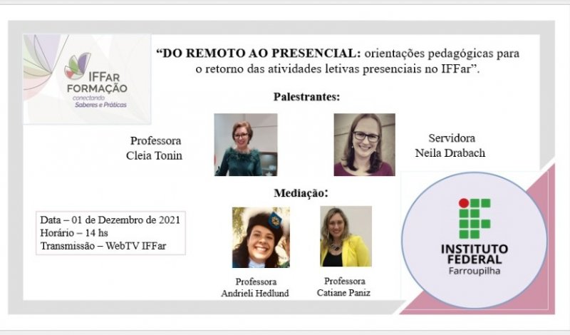 A última atividade do IFFar Formação ocorre nesta quarta-feira (1º), às 14h, com transmissão da WebTV. Tem como tema "Do Remoto ao Presencial: orientações pedagógicas para o retorno das atividades letivas presenciais no IFFar".