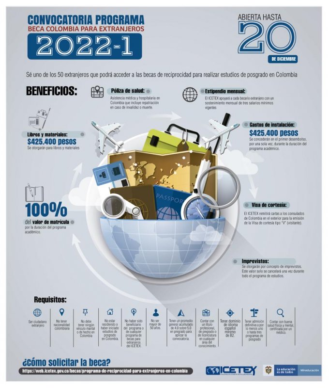 A bolsa é oferecida pelo Instituto de Crédito Educativo y Estudios Técnicos en el Exterior – Icetex e permite a estudantes estrangeiros realizar programas de pós-graduação em Instituições de Educação Superior colombianas com custo de matricula 100% patrocinado e apoio econômico para manutenção. A bolsa inclui benefícios como plano de saúde, visto de cortesia, ajuda de instalação e para aquisição de livros e materiais. Há 50 vagas disponíveis.