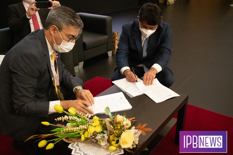 Foto: Cláudio da Rocha, presidente do Conif, no lado esquerdo da foto, assina acordo com CCISP (Instituto Politécnico de Bragança)