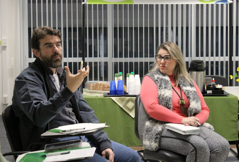 Foto: o professor da UFN Márcio Taschetto da Silva, fala sobre o Cidades Educadoras ao lado da coordenadora do projeto no IFFar, professora Adriana Zamberlan