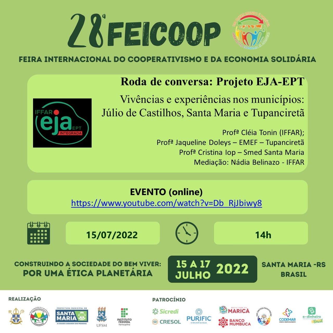 14:00 - 16:00 – (online) Mesa Redonda Projeto EJA-EPT: vivências e experiências no IFFAR em parceria com os Municípios de Júlio de Castilhos, Santa Maria e Tupanciretã – (Educação de Jovens e Adultos integrada à Educação Profissional)