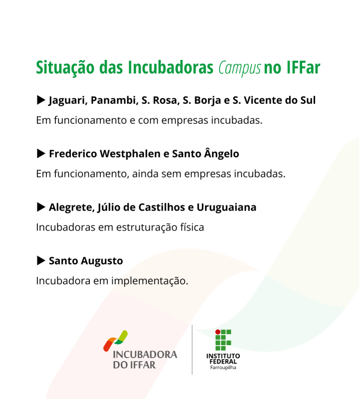 Atualmente, cinco campi do IFFar contam com Incubadoras com empresas em funcionamento: Jaguari, Panambi, Santa Rosa, São Borja e São Vicente do Sul. No total, são sete empresas incubadas. Outros dois campi têm incubadoras já instaladas: Frederico Westphalen e Santo Ângelo. Nestas unidades, serão lançados editais para a seleção de empresas ainda no segundo semestre de 2022. Os campi Alegrete, Júlio de Castilhos e o Campus Avançado Uruguaiana estão em processo de estruturação de unidades incubadoras.