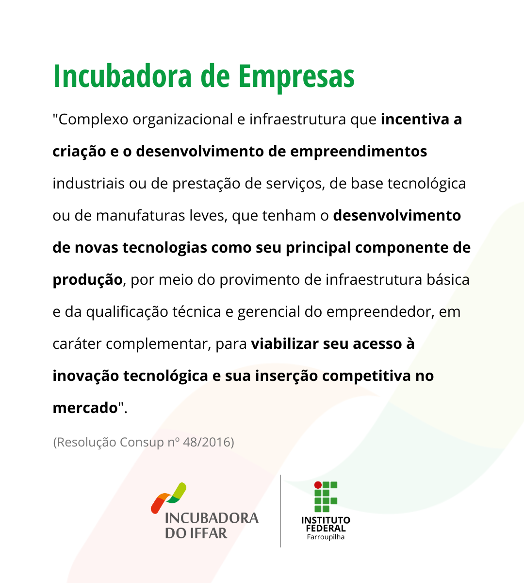 Para entender melhor como funciona a Incubadora de Empresas de Base Tecnológica do IFFar, vale conferir a definição trazida pelo seu regulamento (Resolução Consup nº 48/2016): “complexo organizacional e infraestrutura que incentiva a criação e o desenvolvimento de empreendimentos industriais ou de prestação de serviços, de base tecnológica ou de manufaturas leves, que tenham o desenvolvimento de novas tecnologias como seu principal componente de produção”. Ainda conforme o documento, isso é feito “por meio do provimento de infraestrutura básica e da qualificação técnica e gerencial do empreendedor, em caráter complementar, para viabilizar seu acesso à inovação tecnológica e sua inserção competitiva no mercado”.