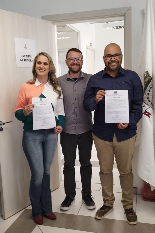 Valéria Pereira Minussi e Edson Uilham de Castro Araújo com o reitor substituto, Carlos Lehn.