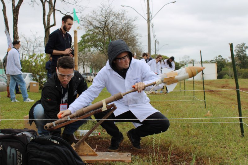 Foto: estudante do IFFar prepara lançamento de foguete durante a Mostra de Foguetes na XIII Mept